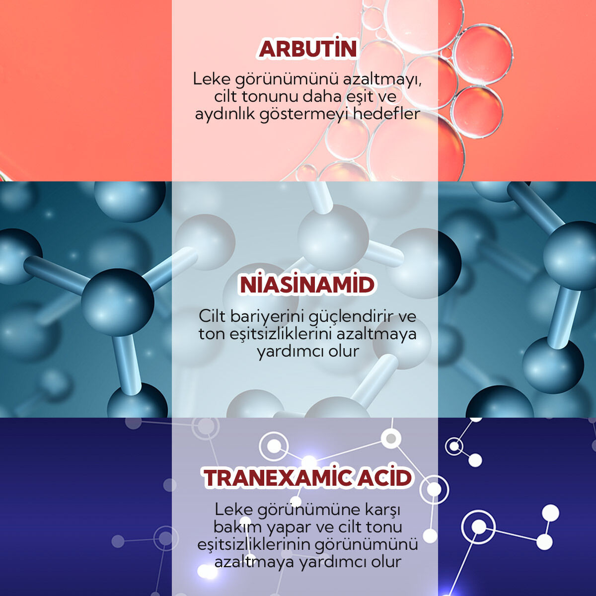 Arbutin, Niacinamide, Tranexamic Acid ve Potassium Azeloyl Diglycinate gibi aktif içerikler sayesinde ciltteki lekelerin ve renk düzensizliklerinin görünümünü azaltmaya yardımcı olur.