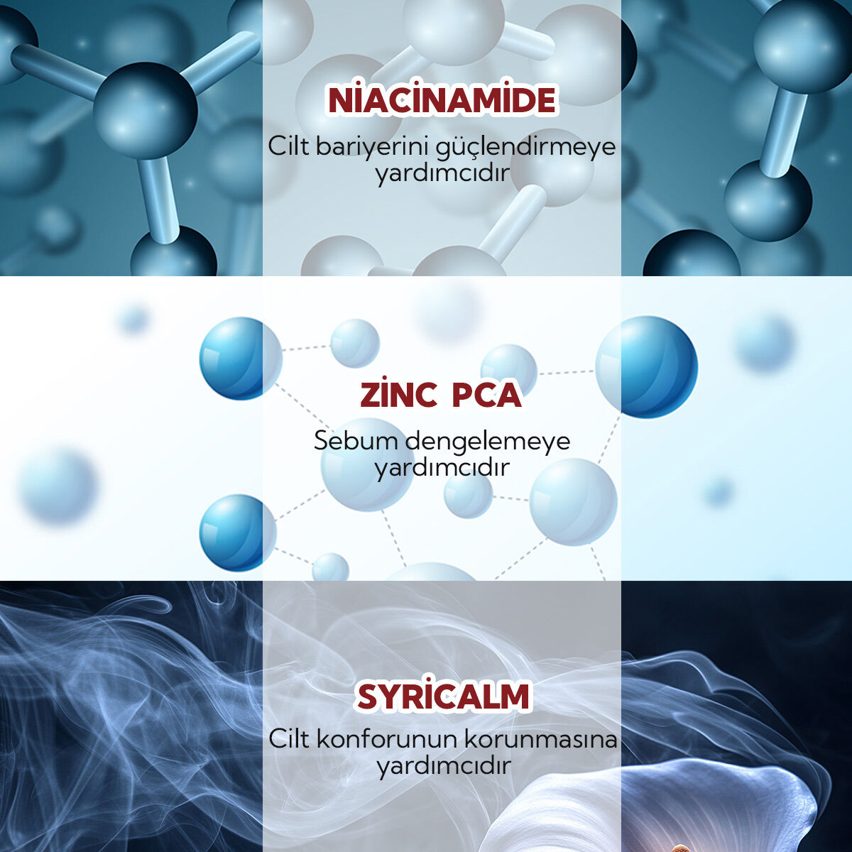 İçeriğindeki Niacinamide, Zinc PCA ve Syricalm ile etkin, yumuşak bir temizlik sağlar.