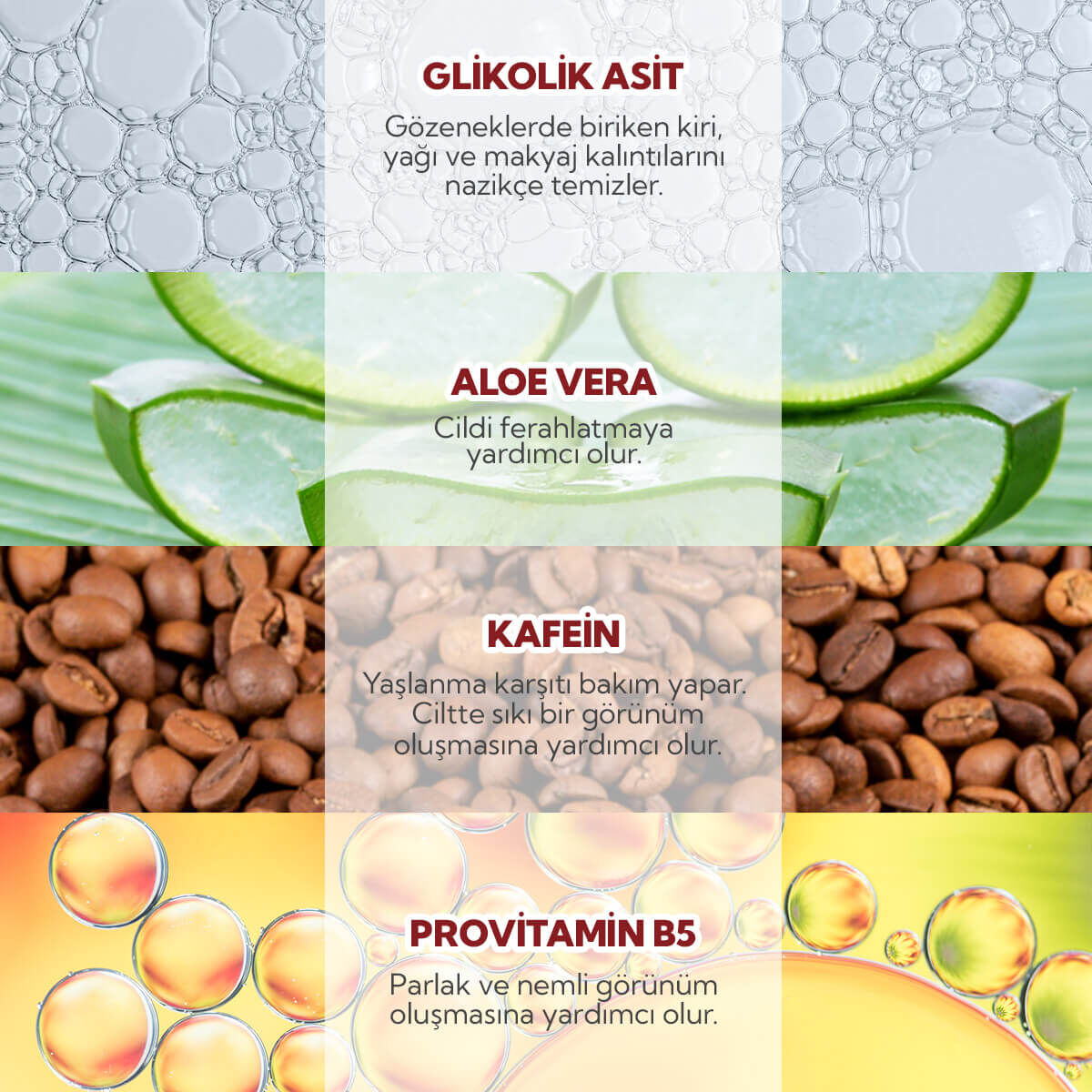 Aqua, Coco Glucoside, Cocamidopropyl Betaine, Glycolic Acid, Aloe Barbadensis Leaf Juice*, Propylene Glycol, Glycerin, Sodium Hydroxide, Sorbitan Caprylate, Sodium Citrate, Zinc Gluconate, Panthenol, Disodium EDTA, Propanediol, Benzoic Acid, Caffeine, Mentha Piperita Oil, Linalool**. *Organik sertifikali **Organik Ucucu ya glardan gelmektedir.