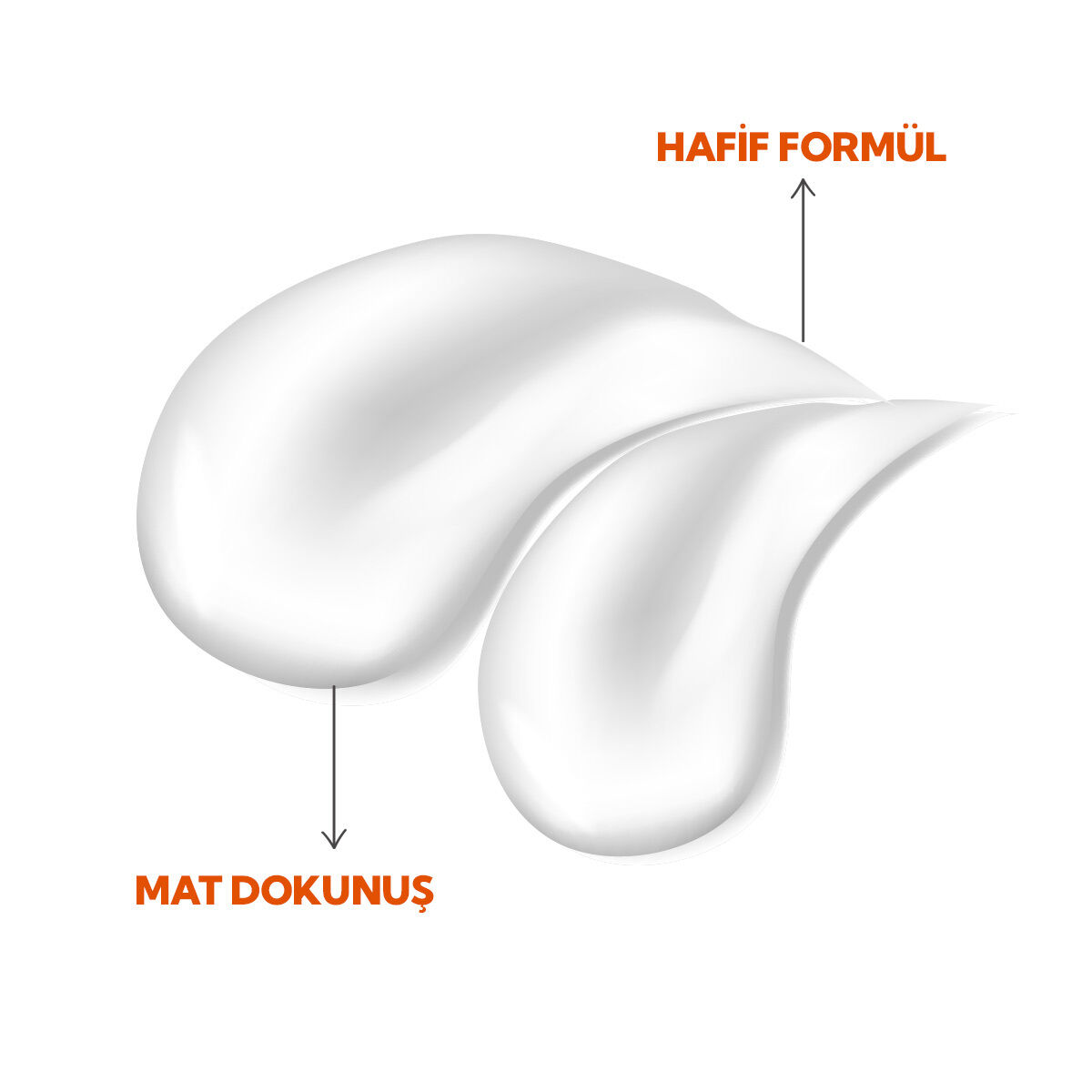 Geniş spektrumlu SPF 50+ UVB/UVA filtreleri, cildi güneşin zararlı ışınlarına karşı etkili şekilde korurken, parlama karşıtı formülü ile yağlı ve karma ciltlerde mat bir görünüm sağlar.