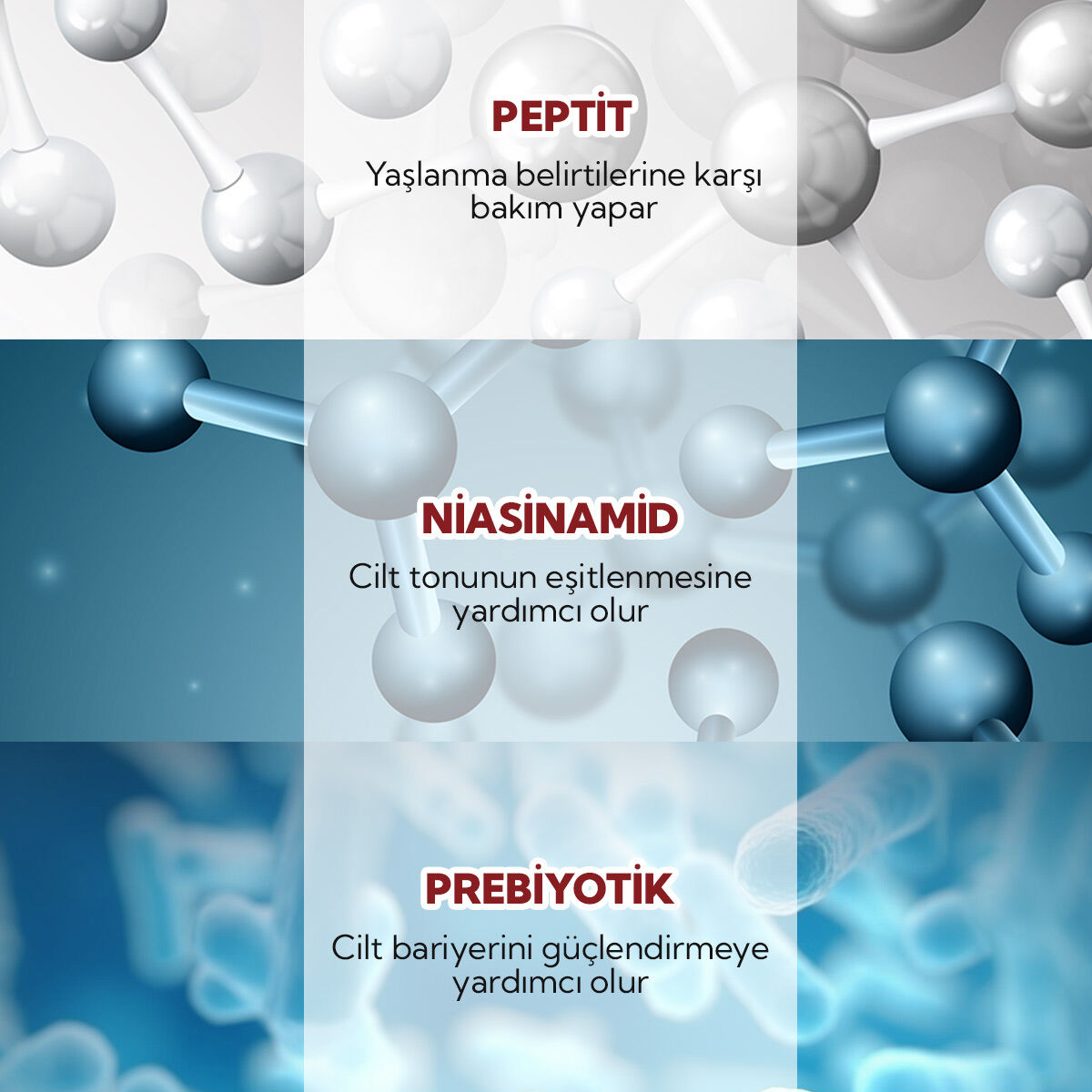 Çinko PCA, saccharide isomerate ve Sodium PCA gibi bileşenlerle cildin doğal nemini korur; inulin (prebiyotik) ile cilt florasını destekleyerek bariyer fonksiyonlarını güçlendirir.