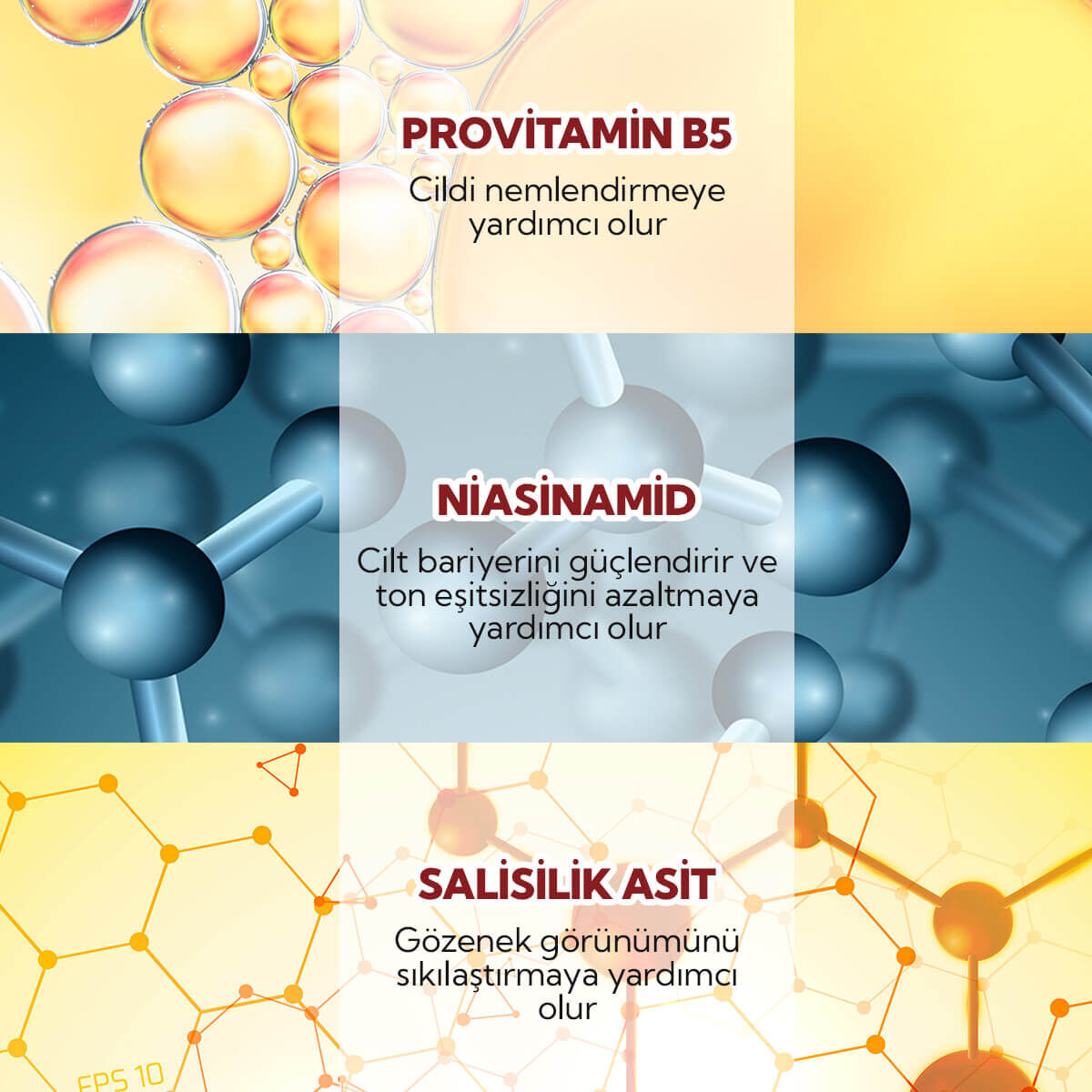 İçeriğindeki salisilik asit, niasinamid ve cadı fındığı ekstresi ile cildi birikmiş sebumdan arındırarak yağlı görünümü azaltır, cilt tonunu eşitlemeye yardımcı olur.