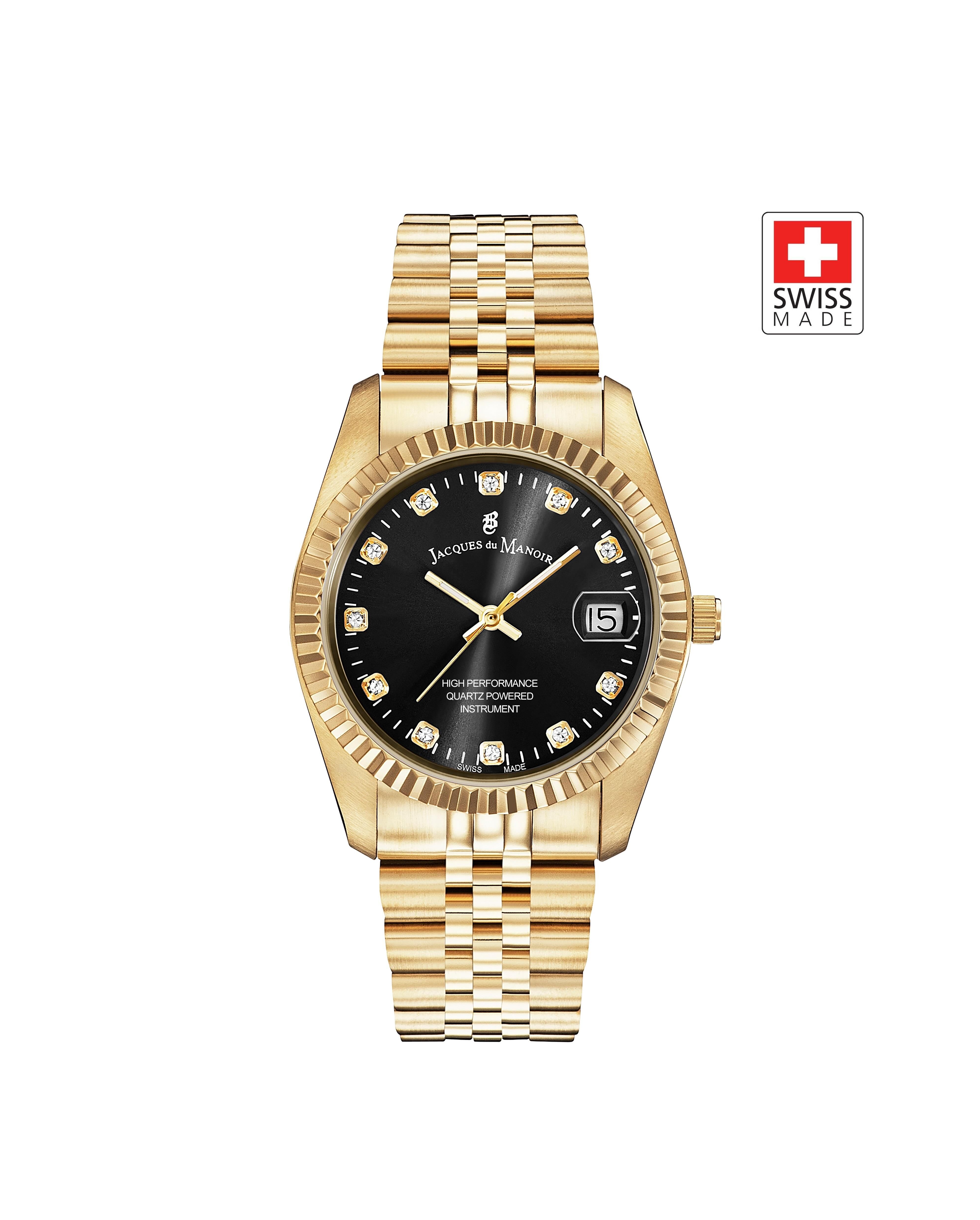 Kasa Çapı: 36 mm - Kasa Şekli: Yuvarlak - Kasa Materyali: Çelik - Kasa Rengi: Altın Rengi - Kordon Materyali: Çelik - Kordon Rengi: Altın Rengi- Kadran Rengi: Siyah - Kadran Işığı: Yok - Taş: Var - Çalışma Şekli: Analog - Teknolojisi: Quartz - Takvim: Var - Kronometre: Yok - Alarm: Yok - Cam Özelliği: Mineral - Özellik: Swiss Made - Su Geçirmezlik: 5 ATM - Garanti Süresi: 2 yıl - Cinsiyet: Kadın