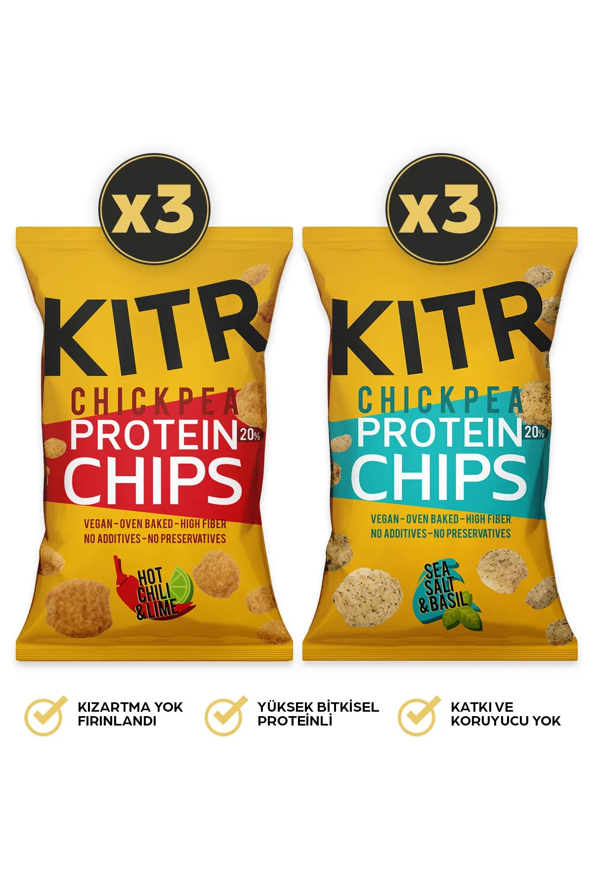Y: KITR 6'lı Acı Biber ve Lime Çeşnili & Deniz Tuzlu ve Fesleğenli Proteinli Nohut Cipsi %15 protein içermektedir.