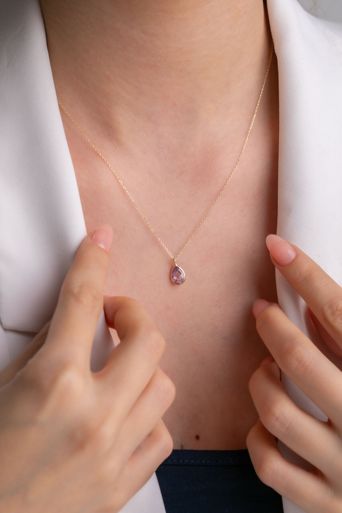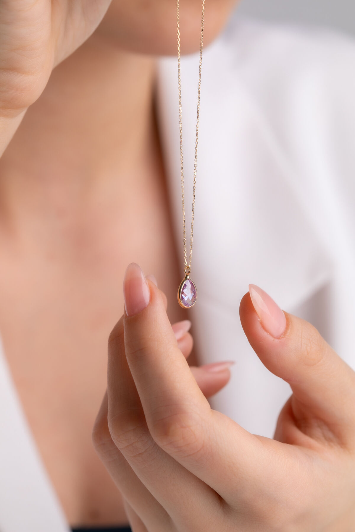 Kolyecik 14 Ayar Altın Damla Taş Lila Kolye