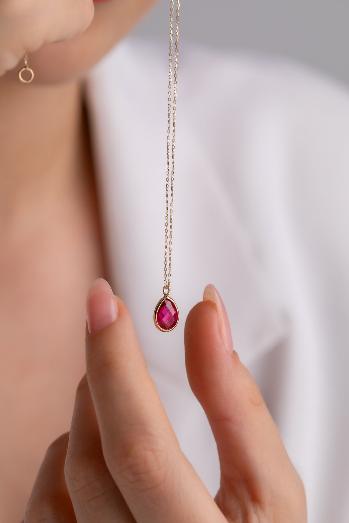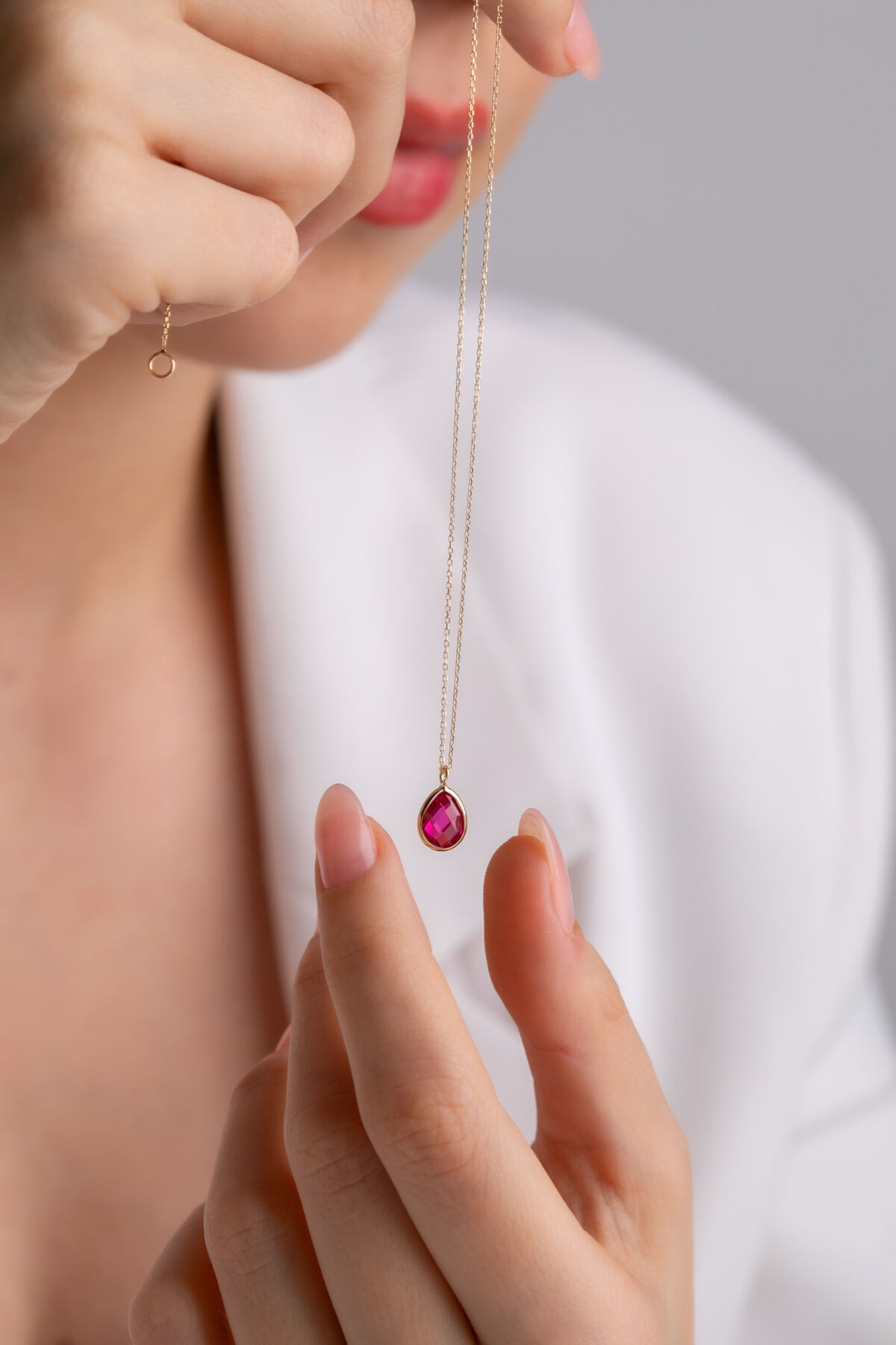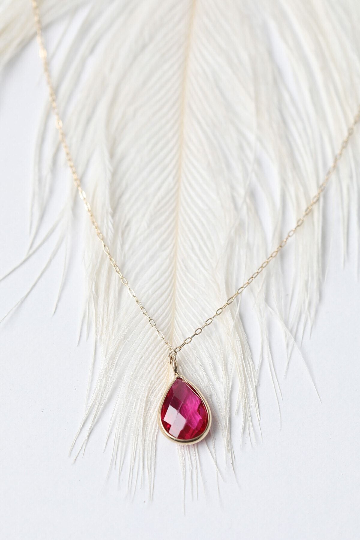 Kolyecik 14 Ayar Altın Fuşya Damla Taş Kolye