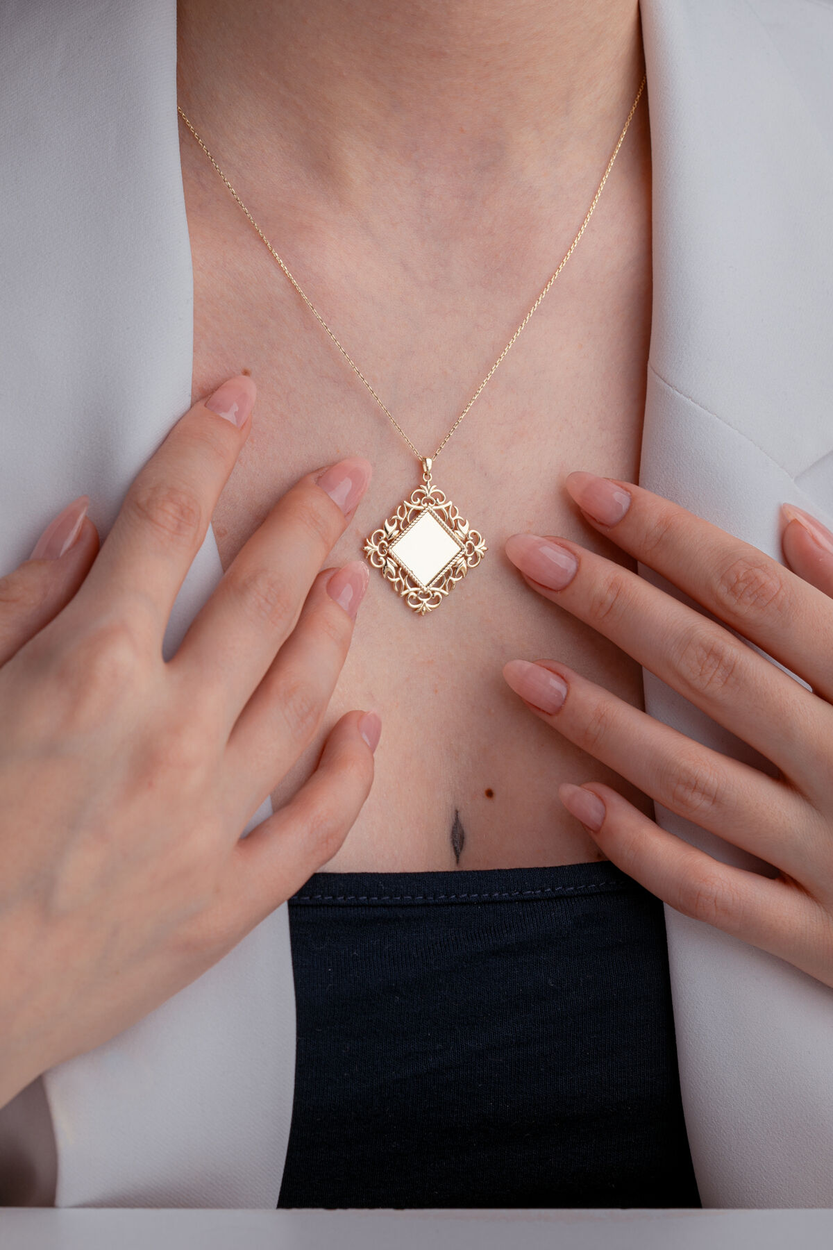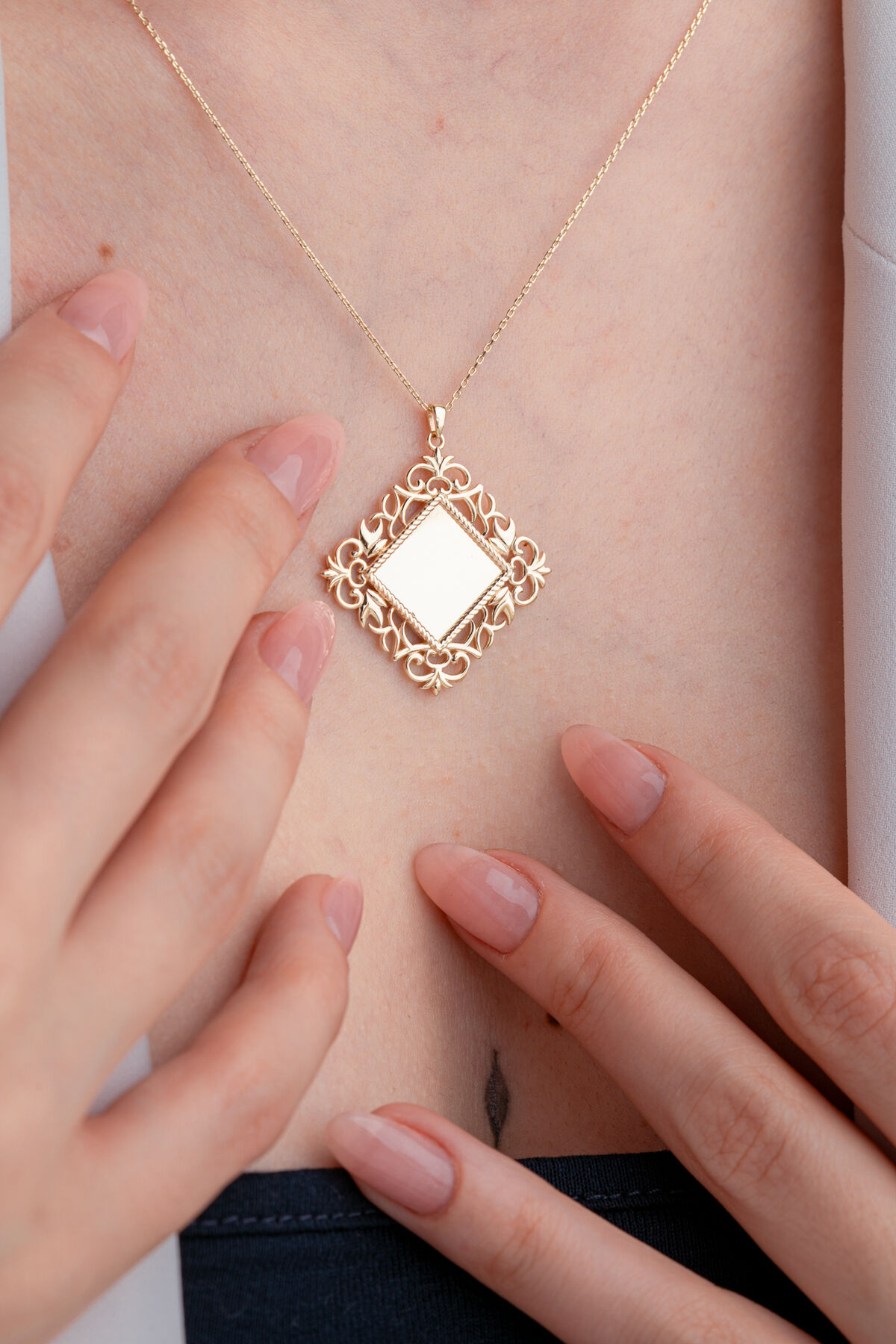 Modern şıklığın en zarif hâlini taşıyan 14 Ayar Altın Kare Ayna Kolye, minimal tasarımın göz alıcı parlaklıkla birleştiği özel bir takıdır. 4,40 gram ağırlığındaki bu kolye, ışığı kusursuz şekilde yansıtan ayna efektli kare yüzeyi sayesinde hem günlük kombinlerde hem de özel davetlerde dikkat çekici bir duruş sergiler. Yüksek parlaklığa sahip yüzeyiyle zamansız bir şıklık sunan kare altın kolye, ustalıkla işlenmiş detaylarıyla uzun yıllar boyunca ilk günkü görünümünü korur. Üstelik siparişiniz, ürünün kalitesini belgeleyen ürüne özel sertifika eşliğinde gönderilir. Tüm siparişler özenle hazırlanarak 2 günde kargoya teslim edilir, böylece şıklığınıza hızlıca kavuşabilirsiniz. Kendiniz için tarzınıza modern bir dokunuş katabilir veya sevdiklerinize özel ve anlamlı bir hediye olarak tercih edebilirsiniz. Işıltısı, minimal hatları ve modern tasarımıyla bu kolye, altın takı severlerin vazgeçilmez parçalarından biri olmaya aday.