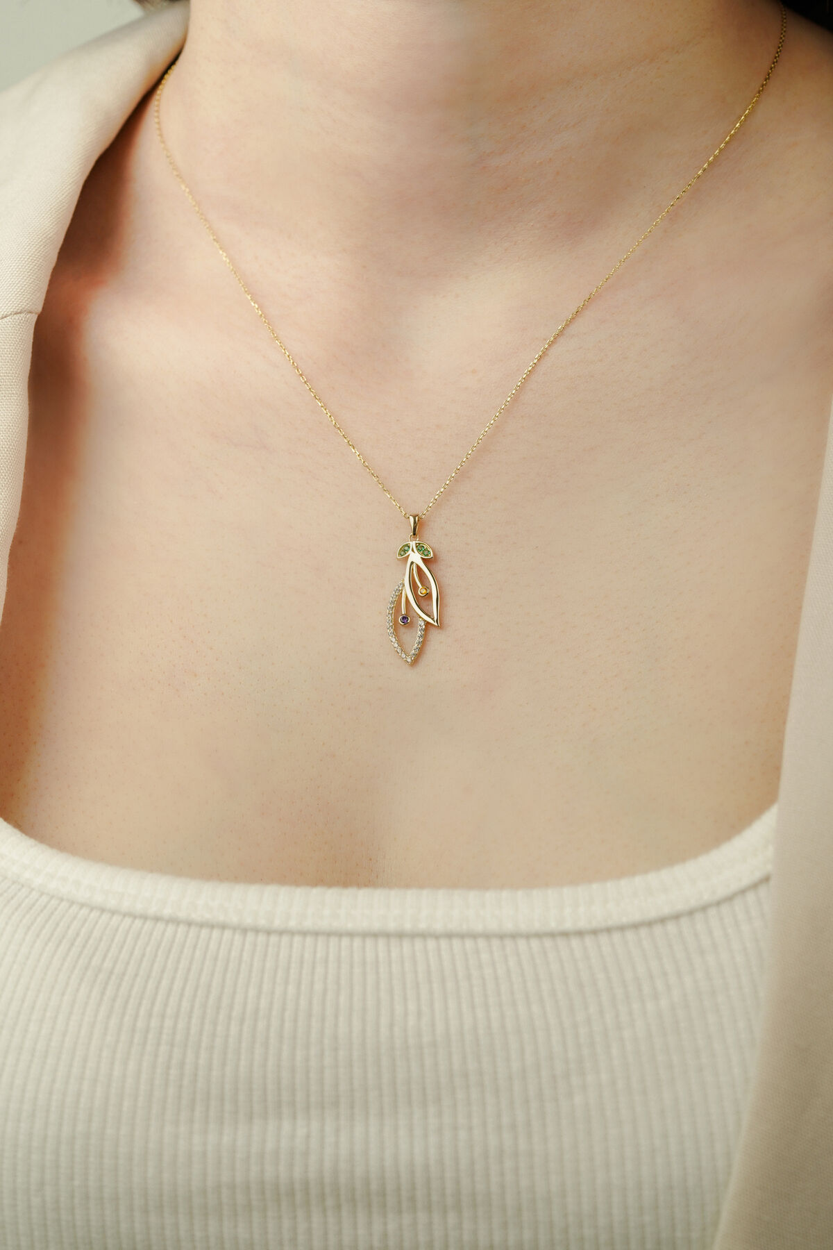 Kolyecik 14 Ayar Altın Kiraz Yaprağı Kolye