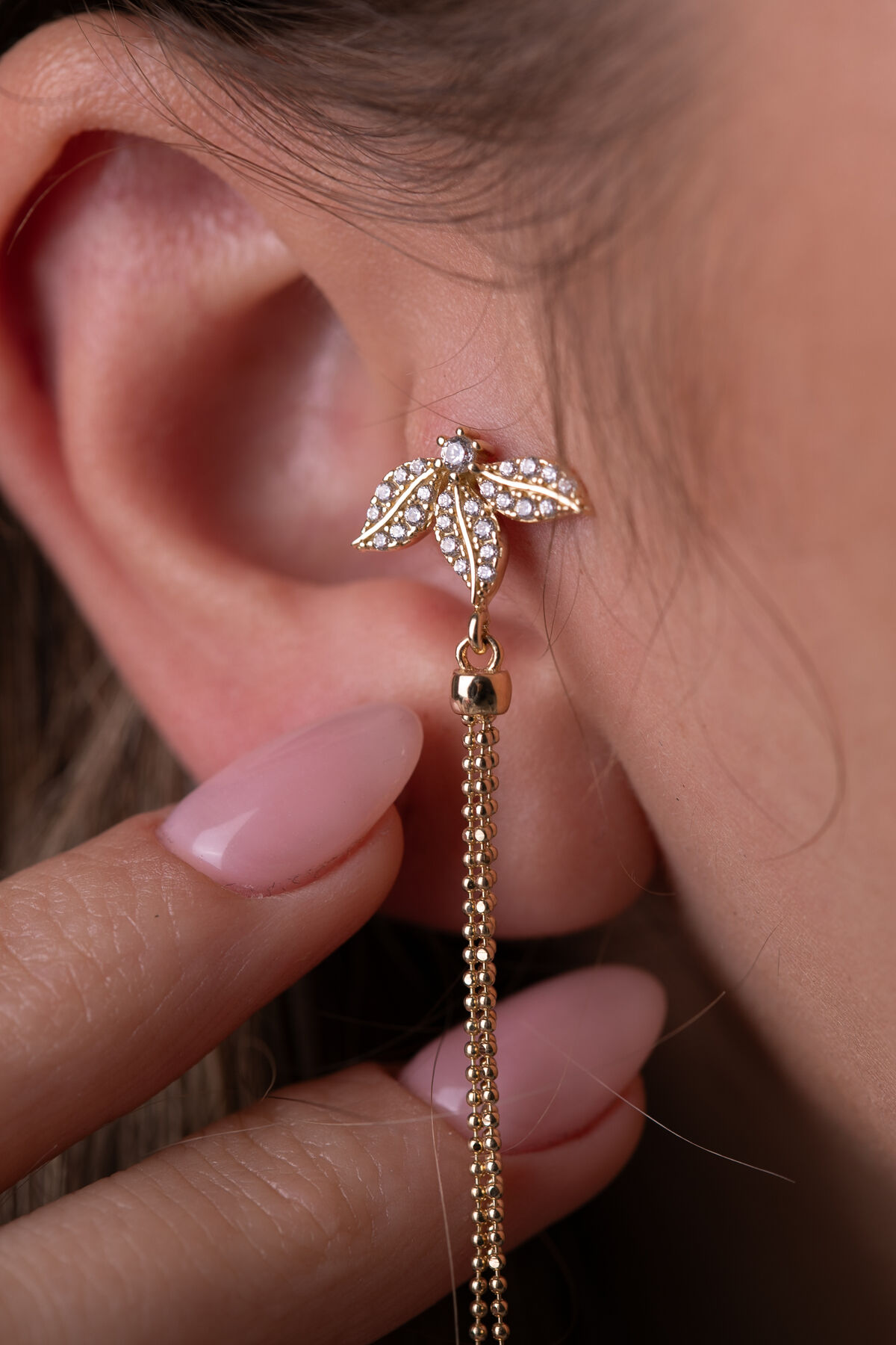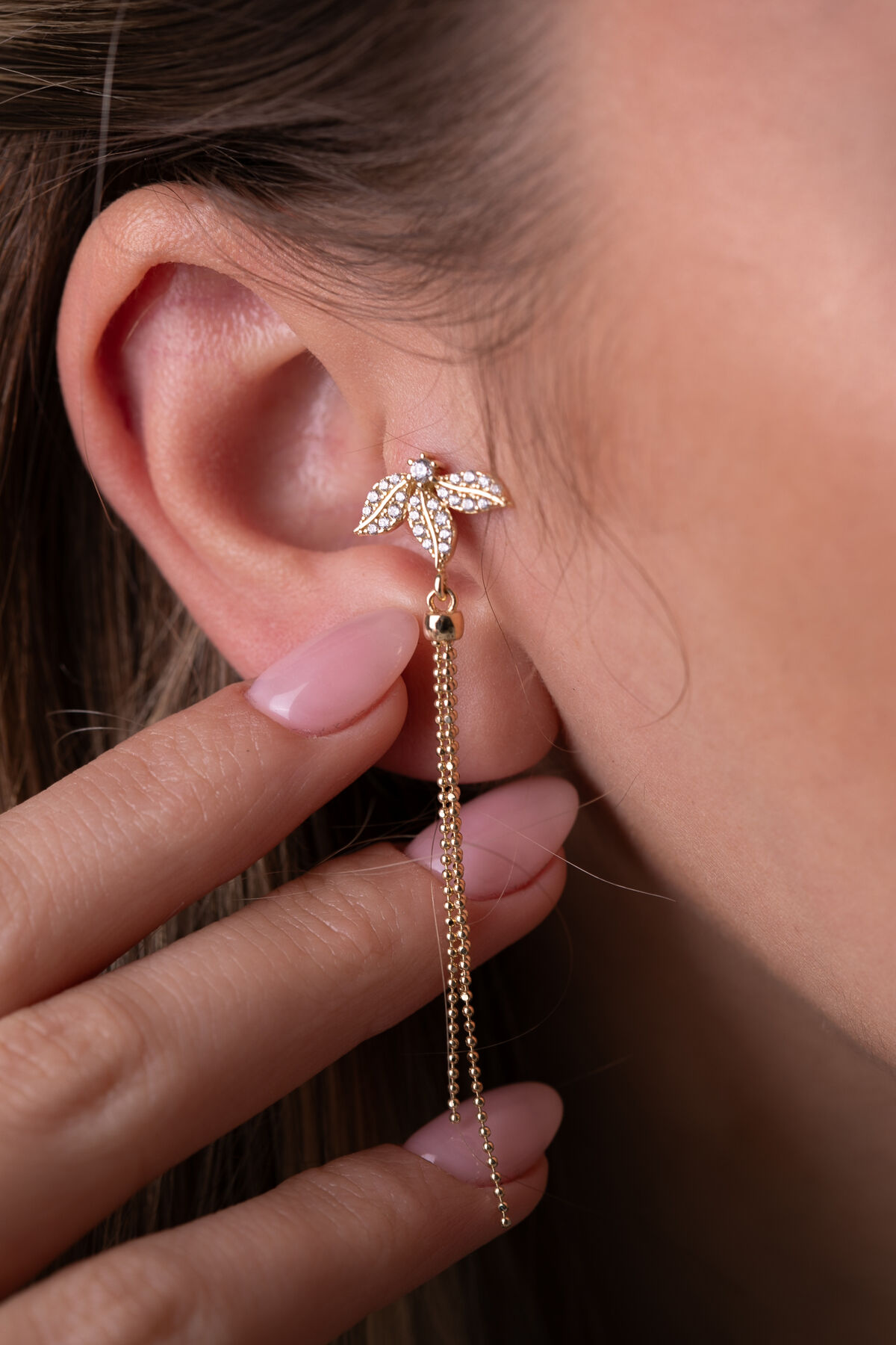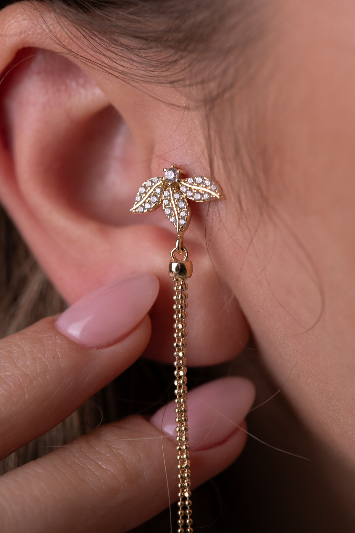 Kolyecik 14 Ayar Altın Lotus Zincir Sallantılı Küpe