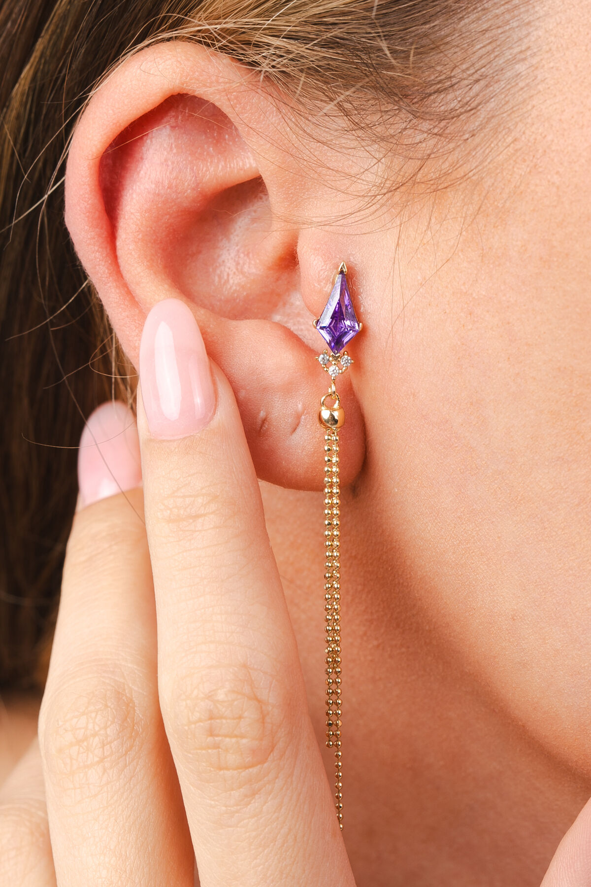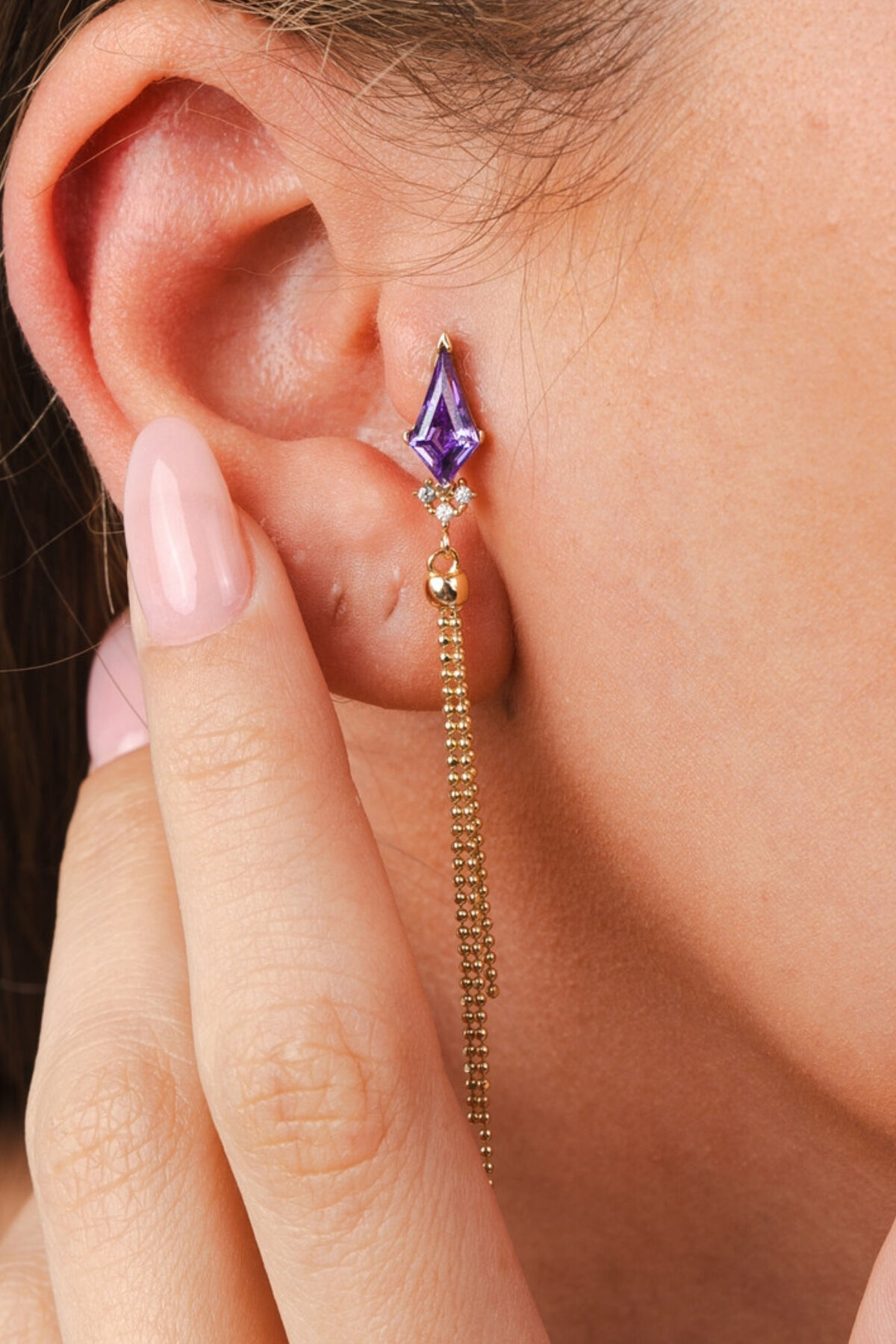 Kolyecik 14 Ayar Altın Mor Uçurtma Taş Zincir Küpe