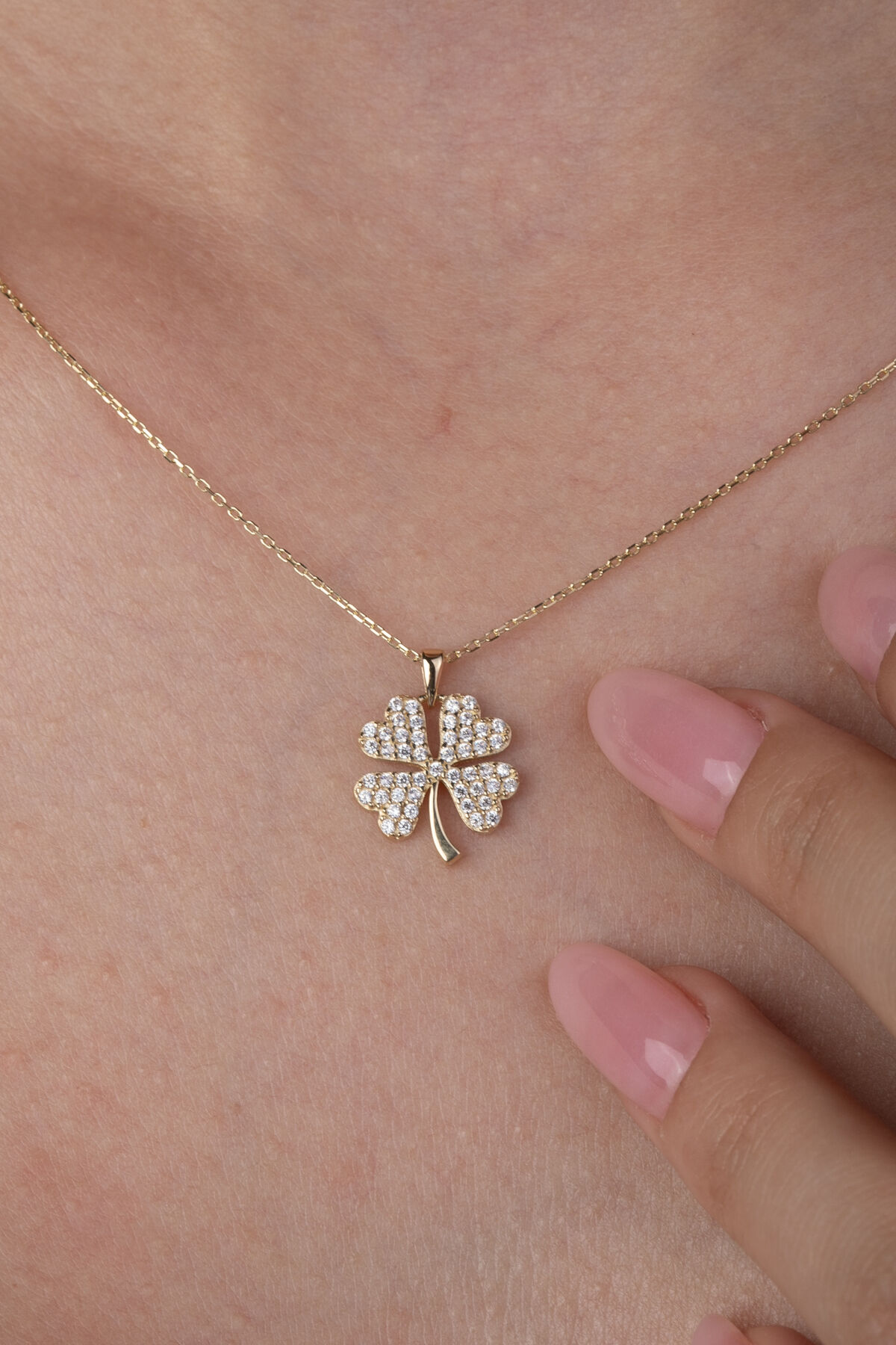 Anlamlı sembolü ve ışıltılı tasarımıyla bu taşlı yonca kolye, hem kendiniz hem de sevdikleriniz için ideal ve şık bir hediye seçeneğidir.
