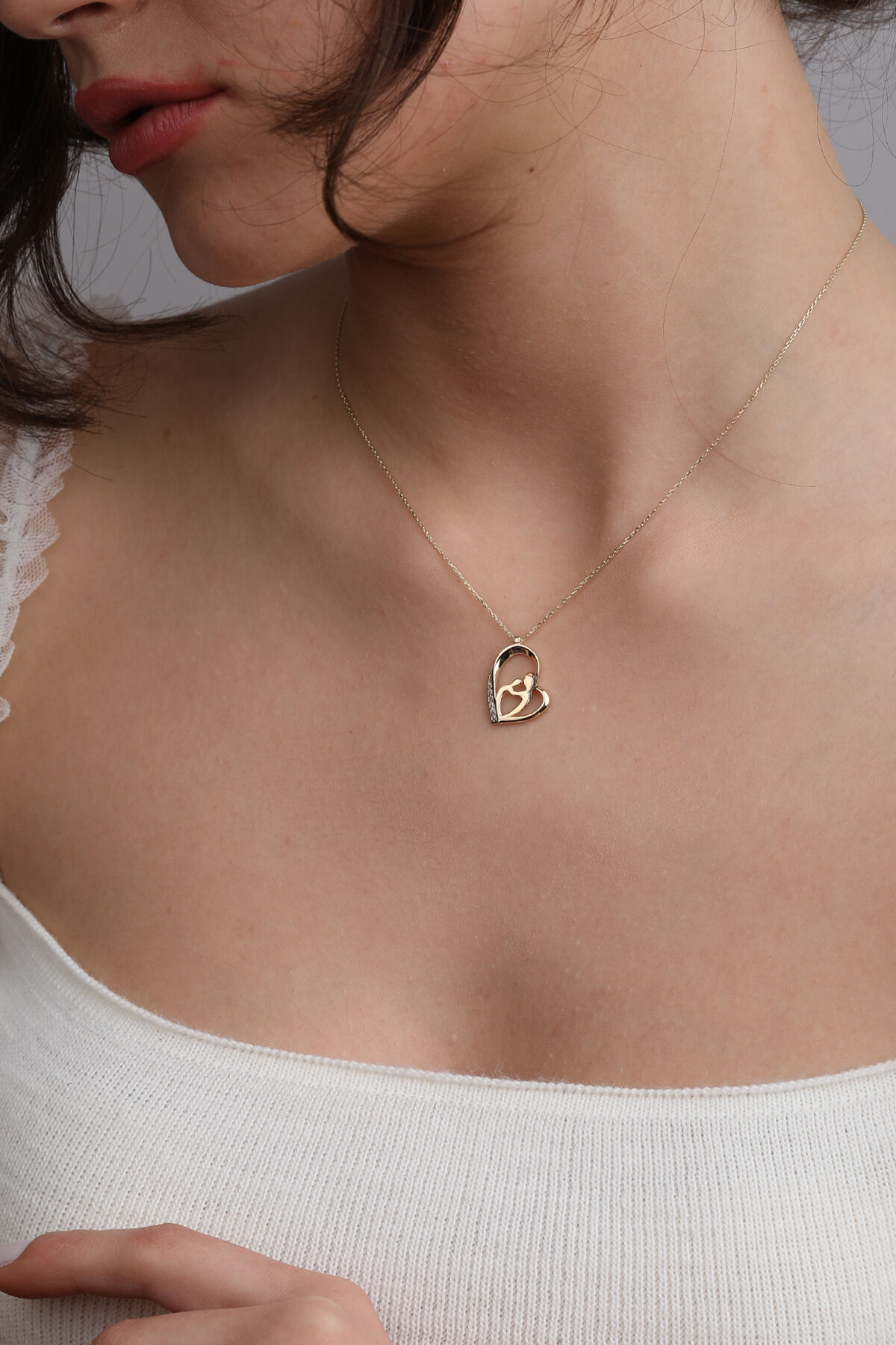 Kolyecik 14 Ayar Altın Yarı Taşlı Kalp Anne Çocuk