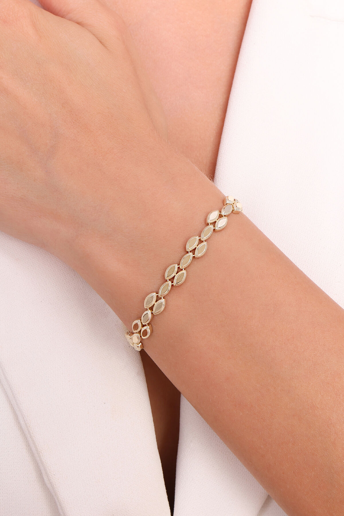 Klasik zarafeti modern dokunuşlarla buluşturan bu 14 ayar altın zincir bileklik, güçlü bir duruşun ve ince zevkin ifadesidir. 6,28 gramlık ideal ağırlığıyla bilekte kendini zarifçe hissettirirken, ışıltılı yüzeyi altının doğal parlaklığını en sofistike haliyle yansıtır. Her halkası, usta işçiliğin izlerini taşıyan kusursuz bir dengeyle birleştirilmiş sade ama etkileyici bir görünüm oluşturmuştur. Günlük hayatta zarif bir tamamlayıcı, özel gecelerde ise stilinizin en dikkat çekici detayı olmaya adaydır. Zamanın ötesine geçen tasarımıyla modanın gelip geçici akımlarına meydan okur. Hem estetik hem kalıcı bir değer sunan bu bileklik, incelikli lüksü yaşam tarzı haline getirenler için tasarlandı. Şık hediye kutusunda, kendinize ya da sevdiklerinize unutulmaz bir armağan olarak sunulur.