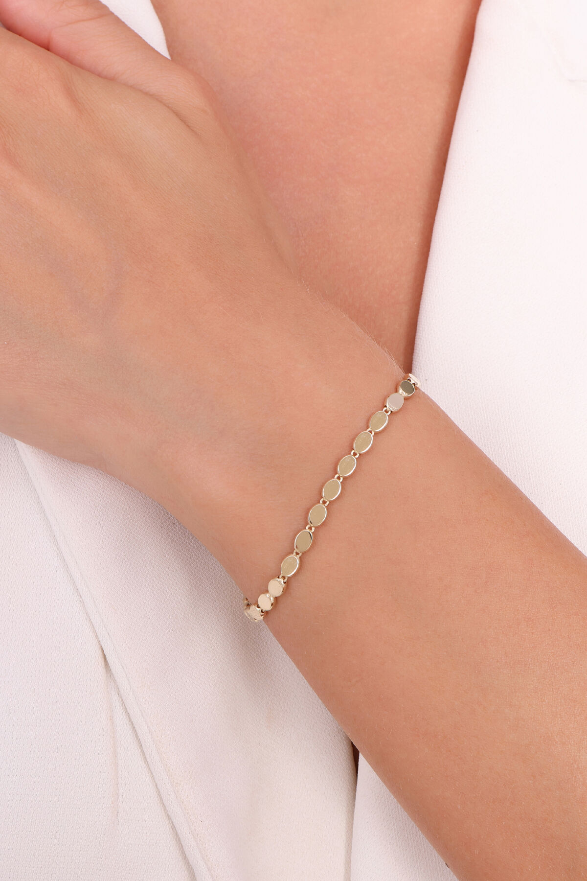 Zarif detaylarıyla ışıltısını sadelikten alan bu 14 ayar altın zincir bileklik, modern lüksün en ince yorumlarından biridir. 3,50 gramlık hafif tasarımı, bileğinizde neredeyse hissedilmeden dururken altının sıcak ve doğal parıltısı her anınıza sofistike bir ışıltı kazandırır. Her bir zincir halkası, titiz el işçiliğiyle kusursuz bir şekilde birleştirilmiş minimal formu sayesinde hem günlük kullanımlarda hem de özel anlarda zarafetinizi ön plana çıkarır. Dayanıklı yapısı, yıllar boyunca ilk günkü parlaklığını korurken zamansız tasarımıyla her stile mükemmel bir uyum sağlar. Sade, asil ve etkileyici... Bu bileklik, gösterişten uzak ama dikkat çeken bir şıklığı tercih edenler için idealdir. Şık hediye kutusunda özenle sunulan bu özel tasarım, sevdiklerinize anlamlı bir armağan ya da kendinize zarafeti taşıyan değerli bir dokunuş olacaktır.
