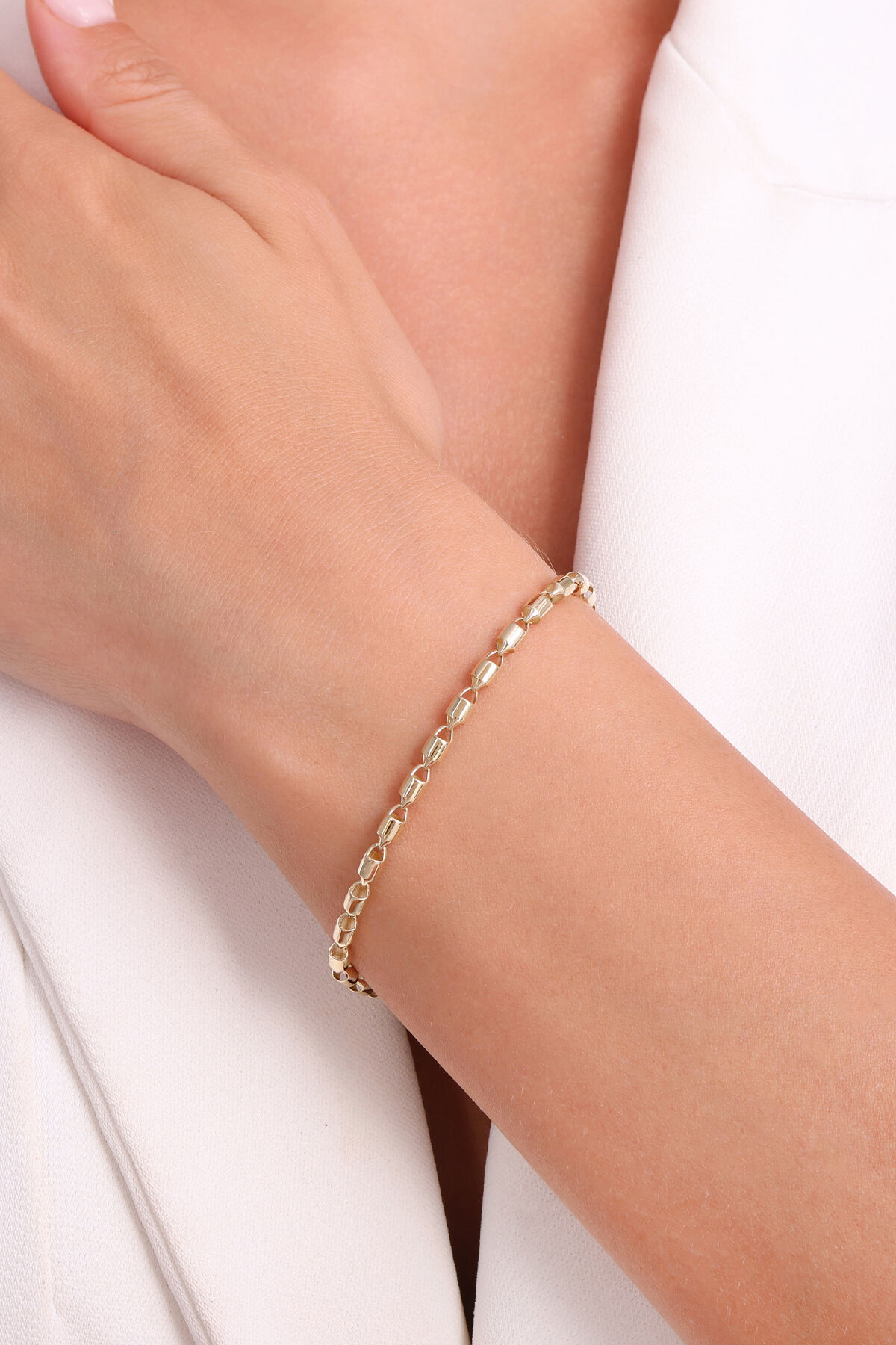 Zarafeti ince detaylarda arayanlar için tasarlanan bu 14 ayar altın zincir bileklik, sade şıklığın en etkileyici hâlidir. 3,34 gramlık hafif yapısı, bileğinizde zarif bir denge sunarken altının sıcak ışıltısı her ışıkta sofistike bir parıltı yaratır. Usta el işçiliğiyle bir araya getirilen zincir halkaları, minimal formuna rağmen dikkat çekici bir duruş sergiler. Günlük kombinlerinize ince bir lüks dokunuş katarken, özel günlerde asil bir tamamlayıcı olarak fark yaratır. Kalitesiyle uzun yıllar boyunca ilk günkü parlaklığını koruyan bu bileklik, zamansız tasarımı sayesinde modanın ötesinde bir şıklık sunar. Göz alıcı ama abartısız duruşuyla hem klasik hem modern stil anlayışına hitap eder. Şık hediye kutusunda özenle sunulan bu özel parça, sevdiklerinize anlamlı bir armağan ya da kendinize zarif bir ödül niteliğindedir.