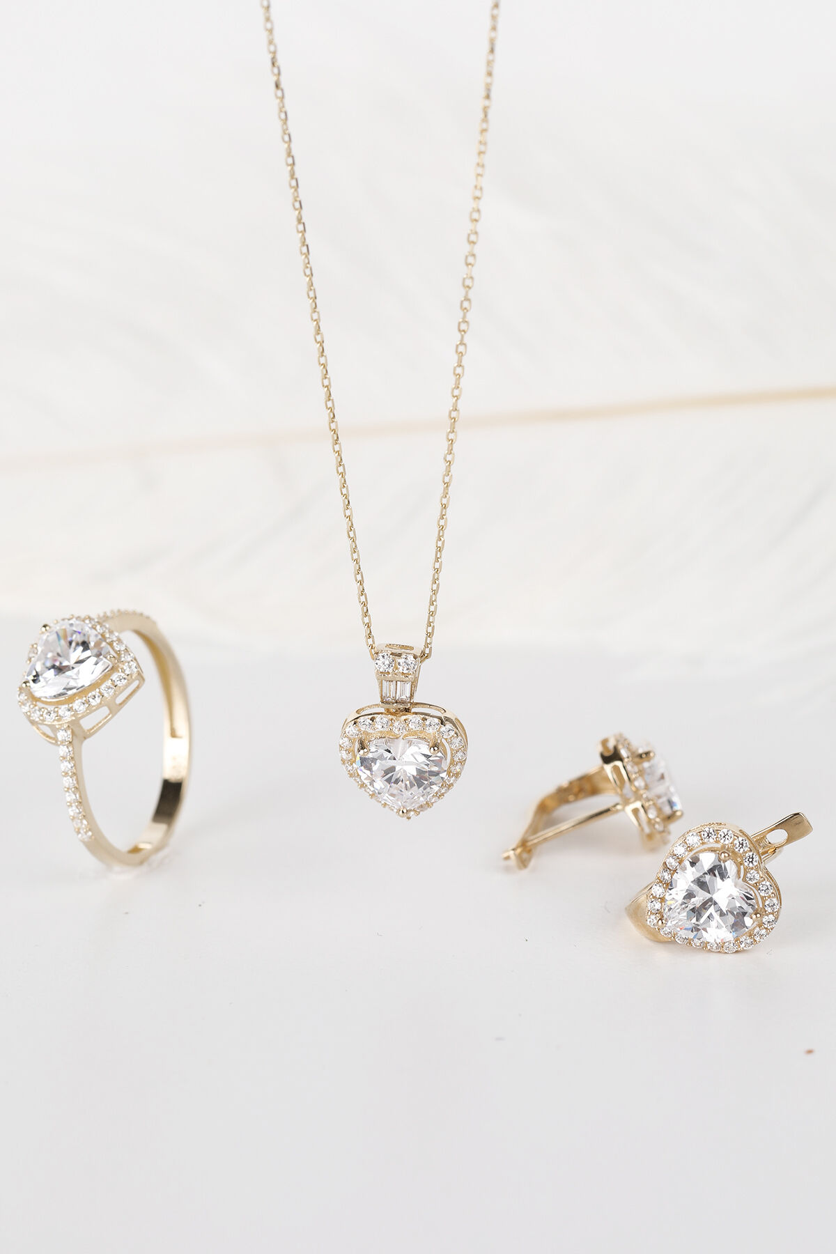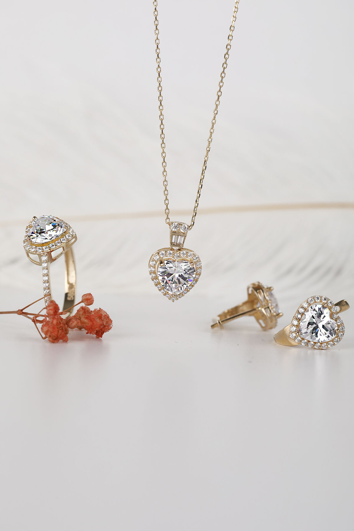 KOLYECİK Altın Kalp Kesim Taşlı Takım, şıklığı ve zarafeti seven kadınlar için mükemmel bir seçimdir. Gündüz günlük kullanımda veya özel davetlerde stilinize zarafet katmak isteyenler için idealdir.