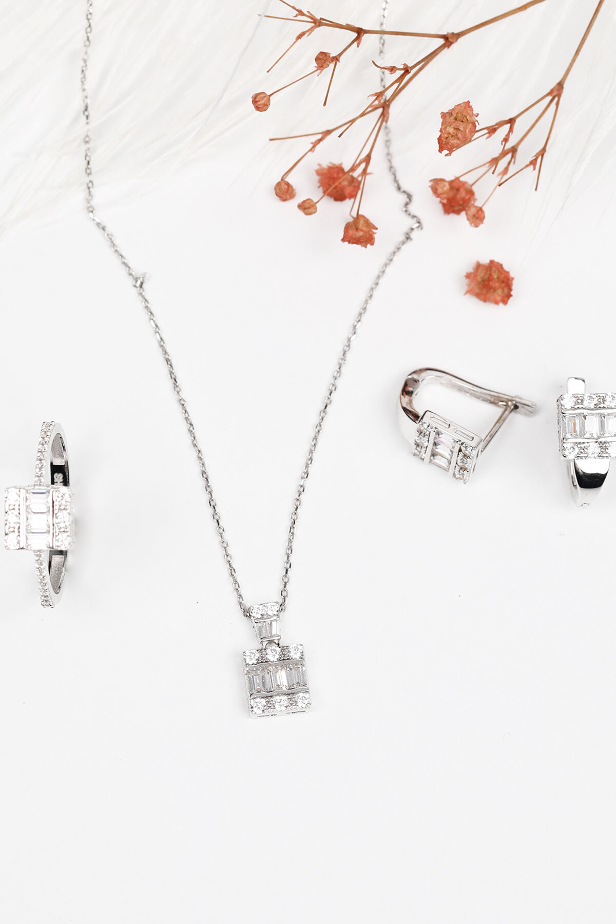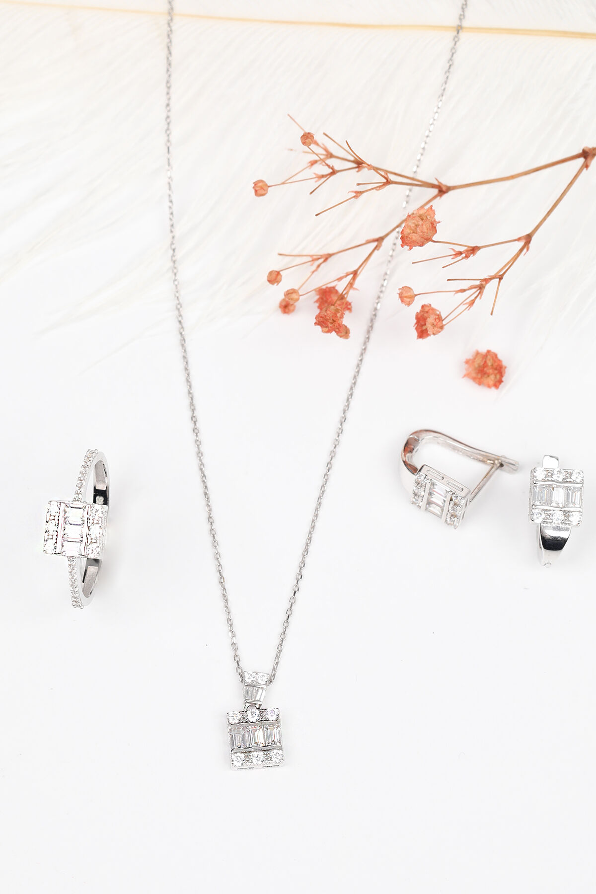 KOLYECİK'in muhteşem yeni tasarımı, altın sıralı baget çıtır takım ile stilinizi tamamlayın. Zarif ve şık tasarımıyla her tarza uyum sağlayan bu kolye ve küpe seti, göz alıcı bir görünüm sunuyor.