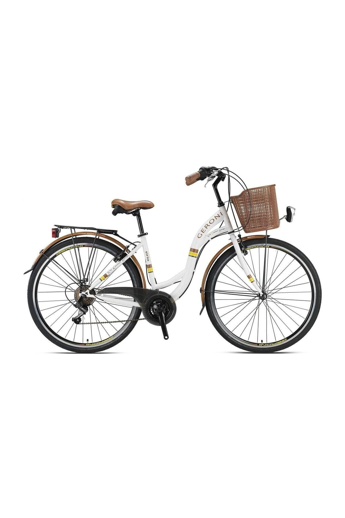Kron Geroni Sirio 28" Jant Çamurluklu Sepetli Şehir Bisikleti Beyaz Kahve Sirio 28 “ City Bike Teknik Özellikleri; Kadro: 28“ Hi-Ten City / Vernik Altı Etiketli Maşa: Çelik Rıgıd Arka Attırıcı: Shimand Tourney Rd – Ty21 Vites Kolu: Shimano Sl – Rs36 / 21 Vites Fren: Alloy / V-Fren Ön Vites: İndeks Jant:28” Çift Kat Lastik: 28 X 1.75 Sele: City Aksesuar: Çamurluk - Arka Taşıyıcı- Taşıyıcı Lastiği – Ön Sepet