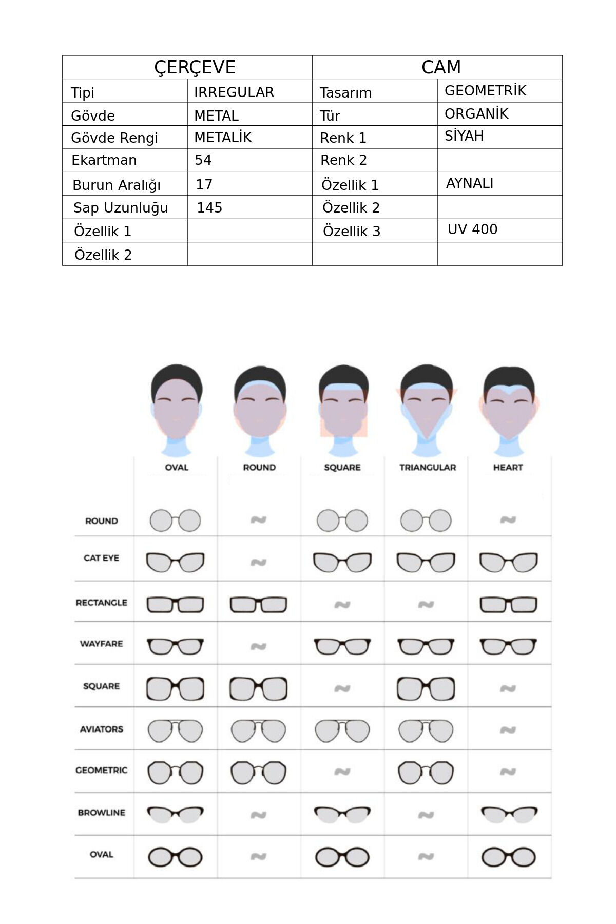 geri gönderim yaparken paketi size geldiği şekilde (Kılıfı, Silme Bezi, Garanti Belgesi ve Faturası ile) göndermeye dikkat etmelisiniz.Özellik Adı Özellik Değeri Tipi .: IRREGULAR Gövde.: METAL Gövde Rengi.: METALİK Ekartman.: 54 Burun Aralığı.: 17 Sap Uzunluğu.: 145 Çerçeve Özellik.: .: Cam Tasarımı.: GEOMETRİK Cam Türü.: ORGANİK Cam Özellik.: AYNALI .: .: UV400 Cam Rengi.: SİYAH .: