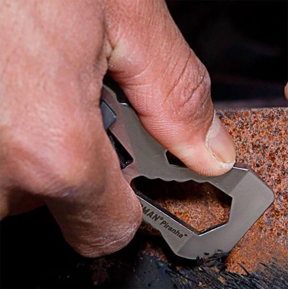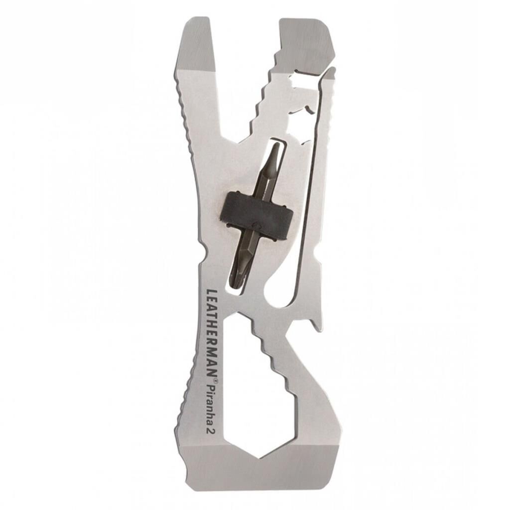 Piranha 2 tek parça, çok amaçlı ısıl işlem uygulanarak üretilmiş %100 paslanmaz çelikten bir cep aletidir. Kauçuktan üretilen burgu tutucu Leatherman burgusunu korur. İsmini aldığı balık olan Piranha gibi, bu cep aleti de işinizi çabucak halletmenize yarar.: Vidaları sıkmak, civata dişlerini gevşetmek ve favori içkinizi patlatmak gibi. Ve bu süper ince çoklu aracı cebinizde hissettiğinizde fark edeceğiniz gibi günlük kullanım için mükemmeldir. Ulaştırma Güvenlik İdaresi’ne uygun olduğundan bir sonraki uçakta yer ayırtırken endişelenmenize de gerek kalmaz.