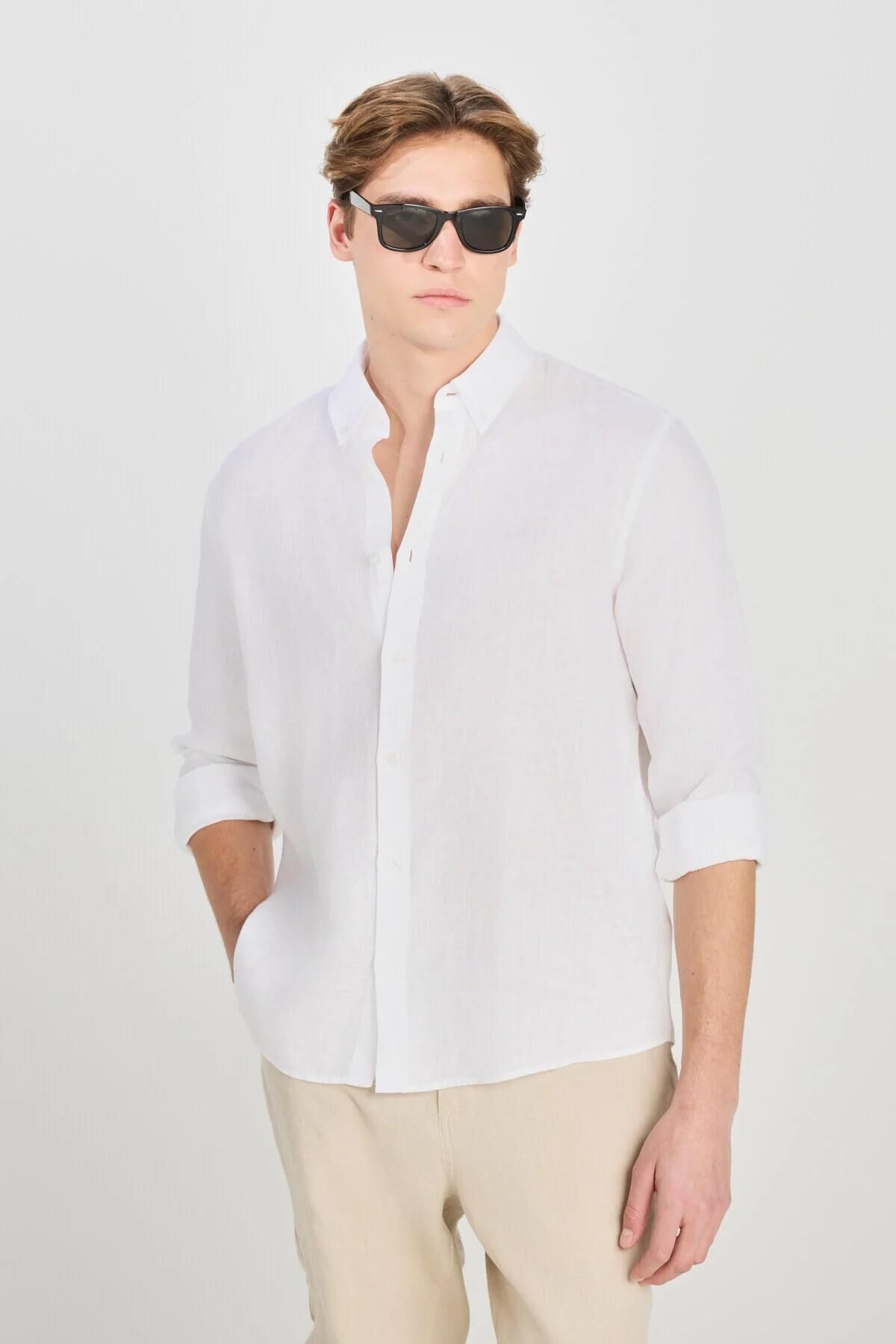 ee - %100 Keten Regular Fit Normal Kesim Beyaz Gömlek %100 KETEN