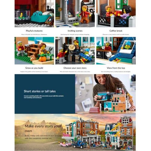 Bu LEGO Creator Expert Modüler Yapılar setiyle Avrupa'da bir kitapçının büyüsünü yaşayın. Eğlenceli teknikler ve kitap rafları, birinci katta kasa, ikinci katta kitap okuma köşesi ve balkon, en üst katta yatak odası gibi sürpriz detaylarla dolu sürükleyici bir modelin keyfini çıkarın. Ayrıca bitişiğinde detaylar ve aksesuarlarla dolu, modelin büyüsünü tamamlayan bir ev var.