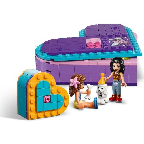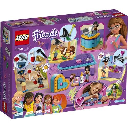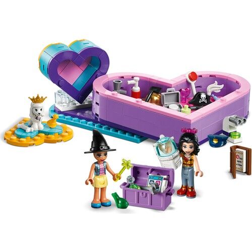 Bu LEGO® arkadaşlık kalp kutularıyla bitmek bilmeyen hikayeleri canlandır! Bu 2 LEGO® Friends kalp kutusuyla Olivia ve Vicky ile birlikte seyahat ederken oyunlar oyna. Olivia hikaye okurken, Vicky’nin karakterleri ve sahneleri canlandırmak için aksesuarları kullanmasına yardım et. Uzayı keşfe çıkan bir astronot ya da sihirli sopasıyla büyüler yapan bir cadı olduğunu hayal et. Büyük kalp kutusunun kapağını Vicky'nin gösterisi için sahne olarak kullan. Oyun bittiğinde, kaniş Lady'yi küçük kutuya koy, diğer her şeyi büyük kutuya doldur ve Kalp Kutusu Arkadaşlık Paketi oyun setini gittiğin her yere götür.