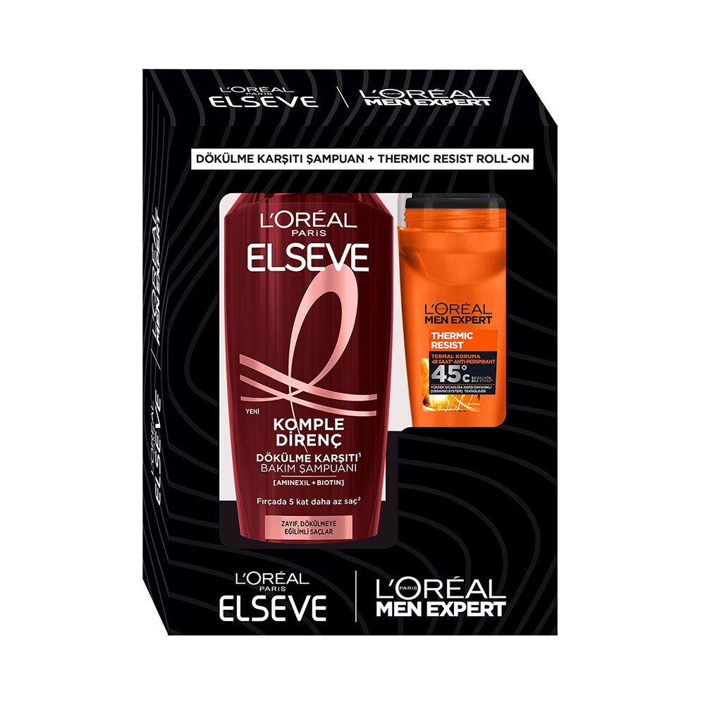 Elseve Şampuan Komple Direnç ve Men Expert Thermic Resist Roll-On seti, saçlarınızı güçlendirirken aynı zamanda cildinizi korur. Saçlarınıza direnç kazandırırken terlemeye karşı etkili koruma sağlar. Bu setle hem saçlarınızı güçlendirin hem de cildinizi koruyun.