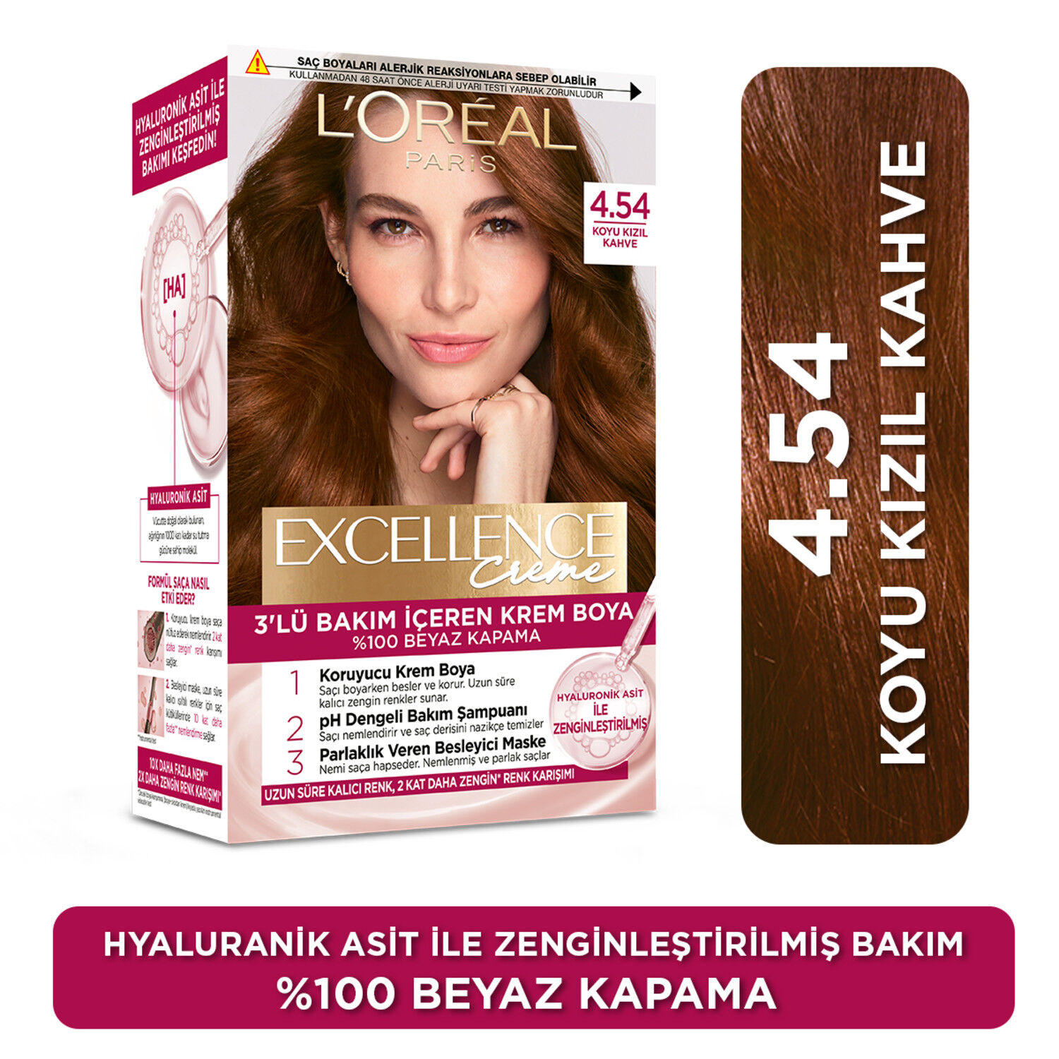 Yeni formül ve ambalaj, aynı renk %100 Beyaz Kapama Uzun süre kalıcı, zengin renk sonucu. Nemlenmiş saçlar & Daha zengin renk karışımı* Hyaluronik asit ile zenginleştirilmiş formül Boyama öncesine göre gözle görülür daha bakımlı saçlar *Önceki boya karışımına (boya+oksidan krem) kıyasla yapılan instrumental viskozite test