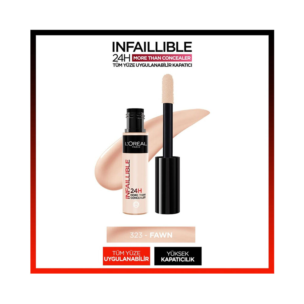 24 saat boyunca sürüldüğü ilk anki kadar üstün bir kapatıcılık özelliği sunan L'Oréal Paris Infaillible 24H Tüm Yüze Uygulanabilir Kapatıcı - 323 Fawn ile yüz doğal bir görünüm kazanır. Hafif yapısı sayesinde cilde kolayca sürülür. Ciltle adeta bütünleşerek gün boyu mükemmel bir performans sunan ürün, makyaj alanında adeta çığır açıyor.