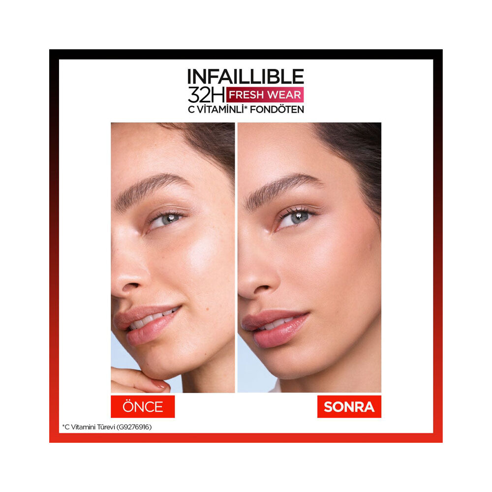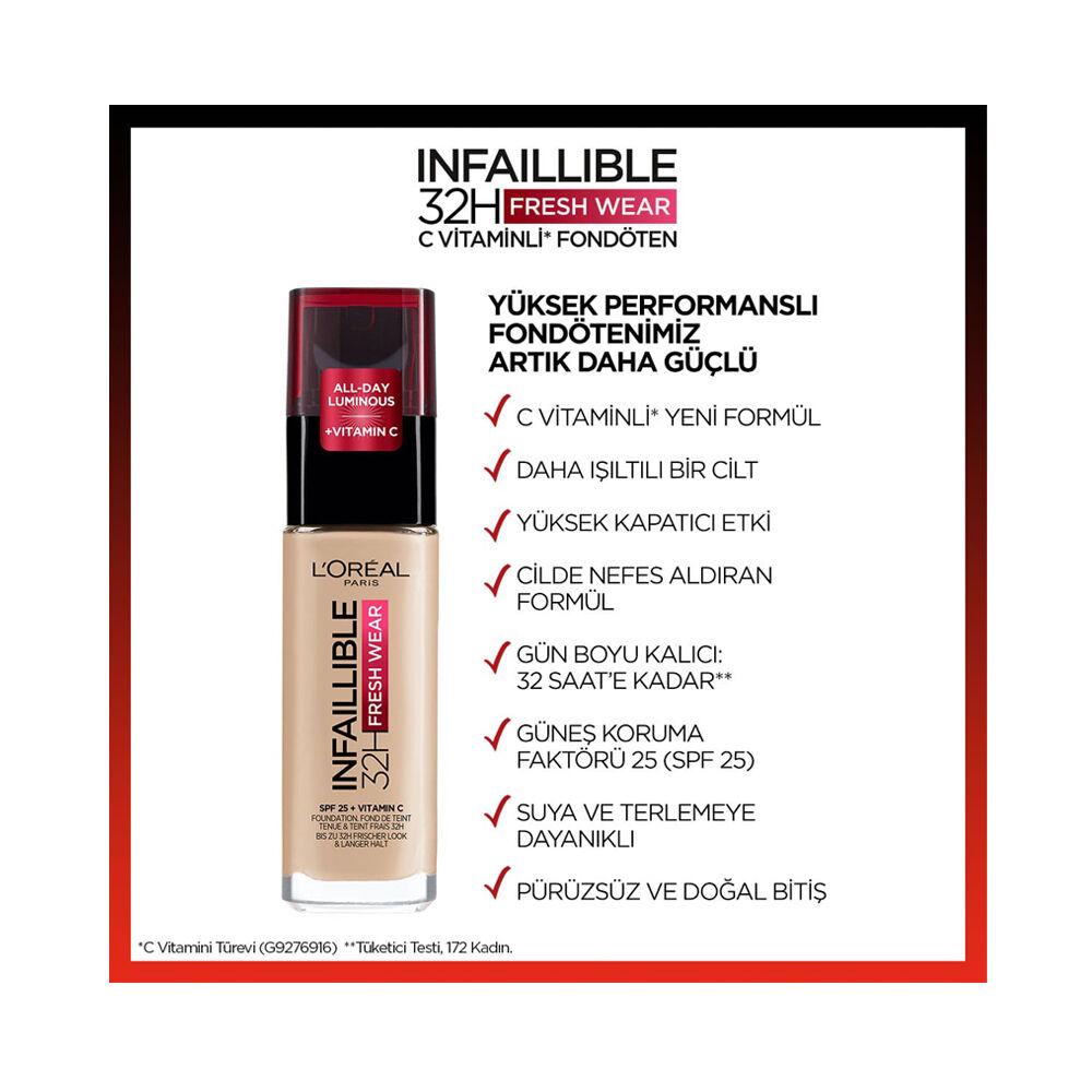 L'Oréal Paris Infallible Fresh Wear Ürün Açıklaması: Dağılan, bozulan ve o en sevdiğiniz bluza bulaşan fondötenler kâbusunuz mu? L'Oréal Paris Infallible Fresh Wear 24H Fondoten 120 Vanilla, son teknolojinin ışığında geliştirilmiş bozulmayan, bulaşmayan, parlamayan, kurumayan, maske görünümlü yaratmayan ve 24 saat kalıcılık vadeden eşsiz formülüyle makyaj severlerin kalbini fethediyor. Makyaj keyfinizi ikiye katlayacak olan L'Oréal Paris Infallible Fresh Wear 24H Fondoten 120 Vanilla, yüz kusurlarını da görünmez kılıyor. L'Oréal Paris Infallible Fresh Wear Ürün Özelliği: Benzersiz formülüyle 24 saat kalıcılığından ödün vermeyen fondöten, canlı ve pürüzsüz cilt görünümü sunar. Yüksek kapatıcılığı, suya ve tere dayanıklı formülü sayesinde akmaz, parlamaz, bulaşmaz, temasa dayanıklıdır. Kusurları kapatırken cildin nefes almasını engellemez. İçeriğindeki hyalüronik kompleks ile nemlendirir. Tüm gün canlılığından bir şey kaybetmemiş taze bir cilt görünümü sağlar. Akışkan kremsi dokusu sayesinde yüzdeki kırışıklıkların içine doluşarak maske gibi yapay bir görünüm oluşturmaz. Hijyen esas alınarak tasarlanmış pompalı cam şişesi sayesinde kolay kullanıma imkân sunar. L'Oréal Paris Infallible Fresh Wear Uygulama Şekli: Üründen bir miktar alıp tüm yüze fırça, el ya da makyaj süngeri yardımıyla iyice yedirin.