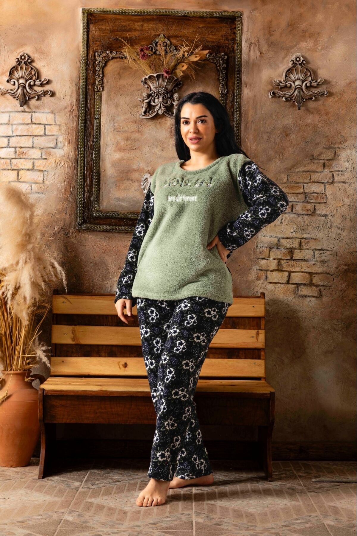 Büyük Beden Peluş Polar Kadın Pijama Takımı - Yeşil Lacivert