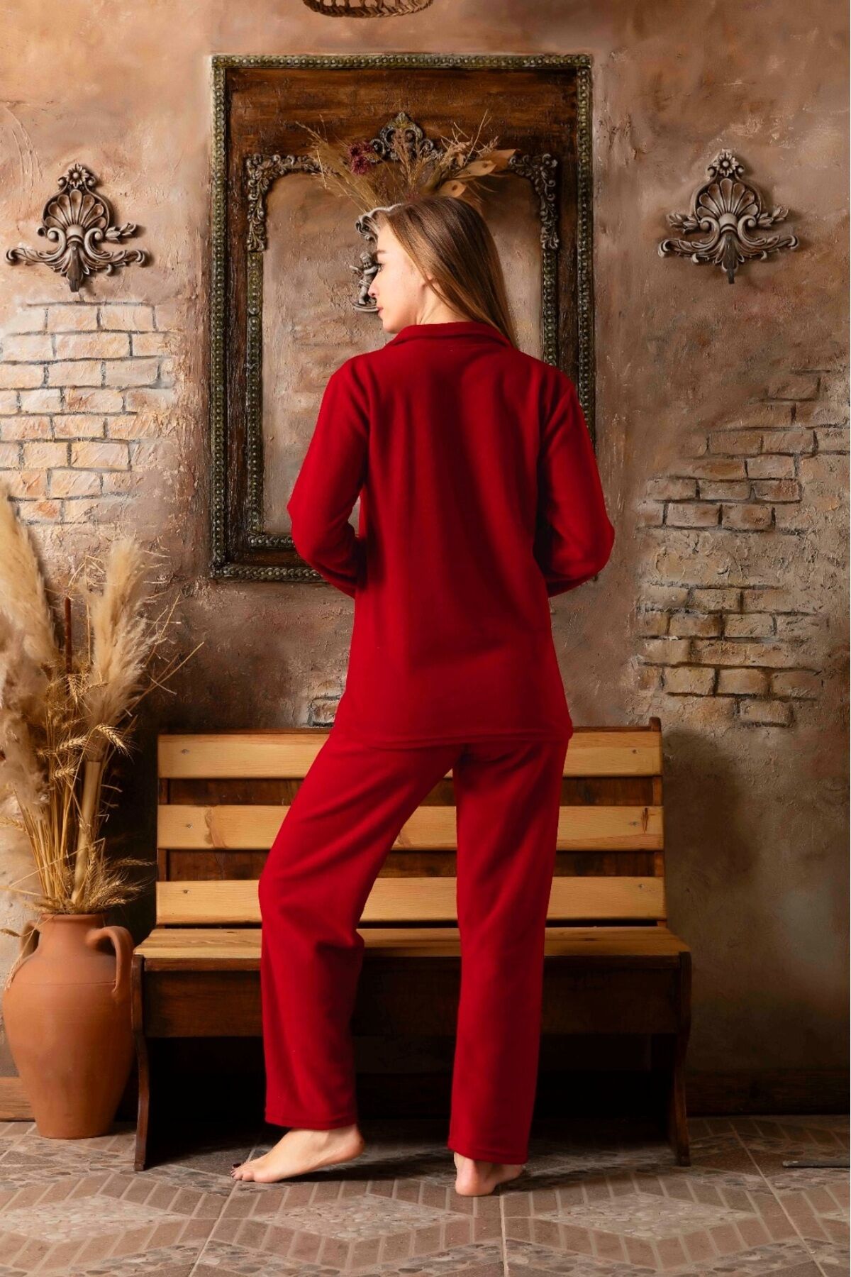 Düz Renk Gömlek Yaka Peluş Polar Pijama Takımı