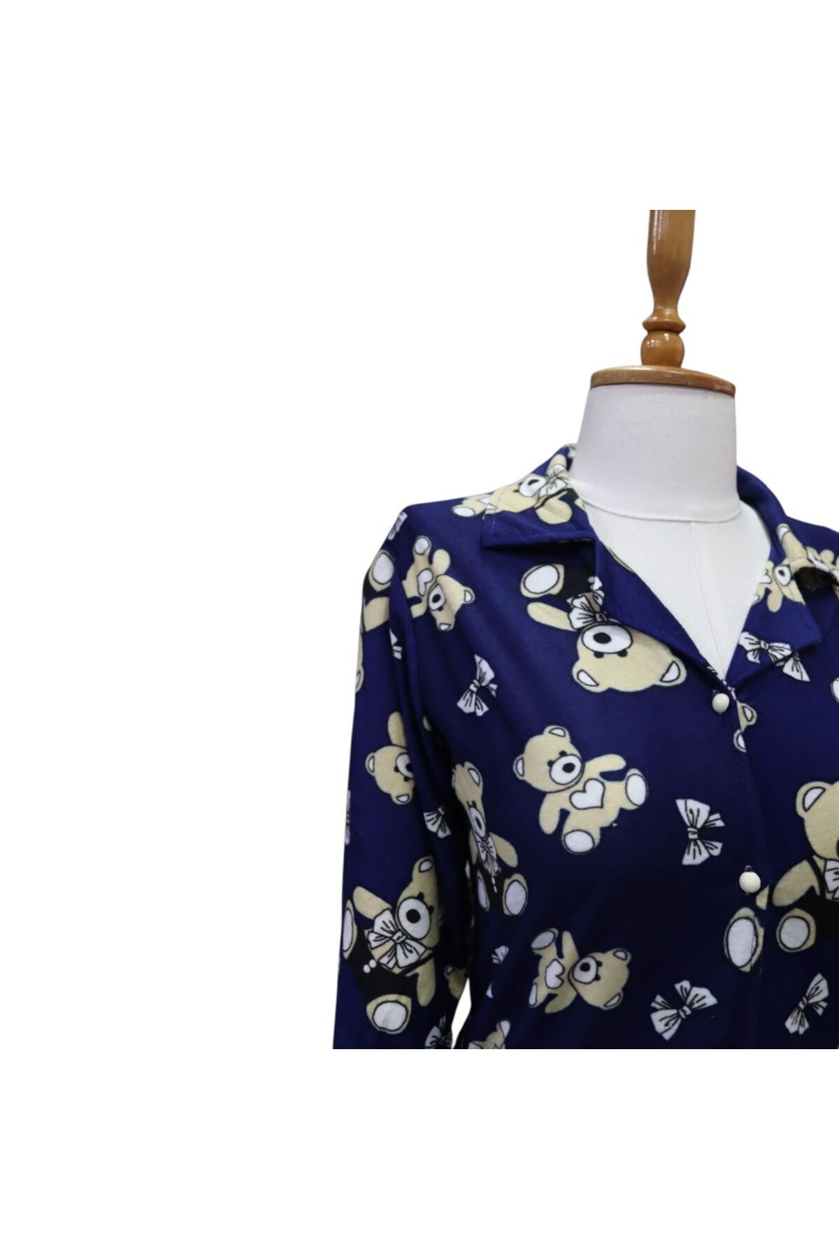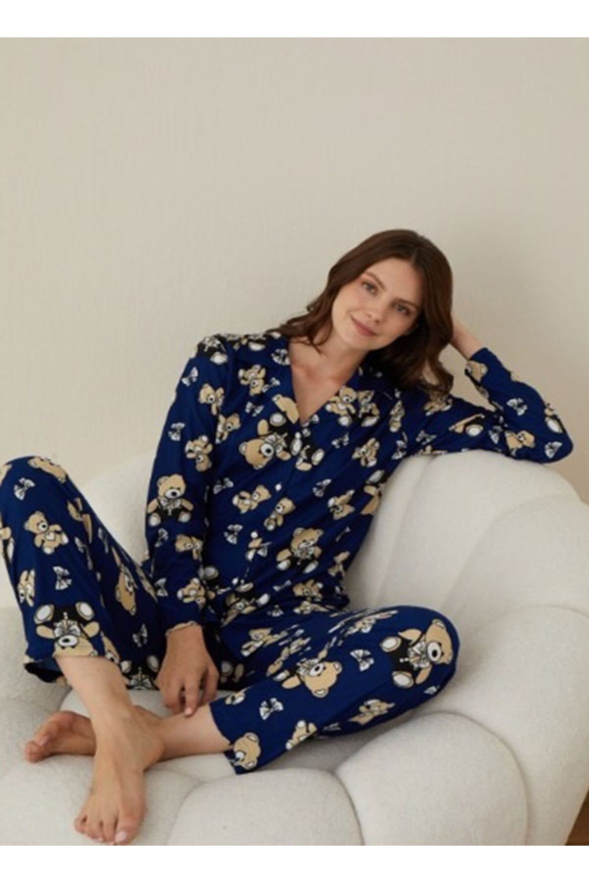 Ekose Desen Gömlek Yaka Süet Kadın Pijama Takımı - Mavi Ayıcık Desen