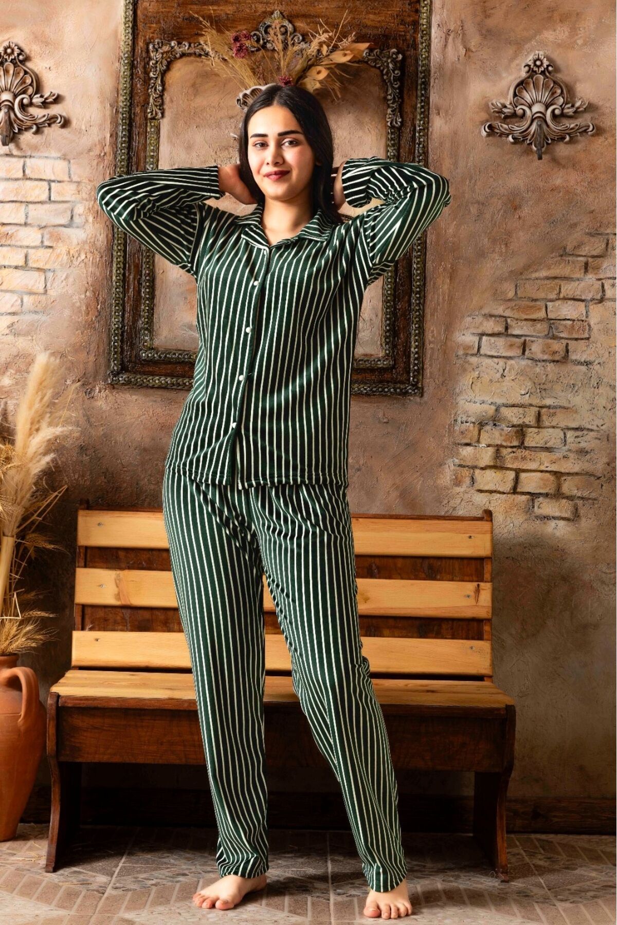 Çizgili deseniyle zamansız bir stil oluştururken, kadife dokumasıyla lüks hissiyatını ev giyimine taşır.
