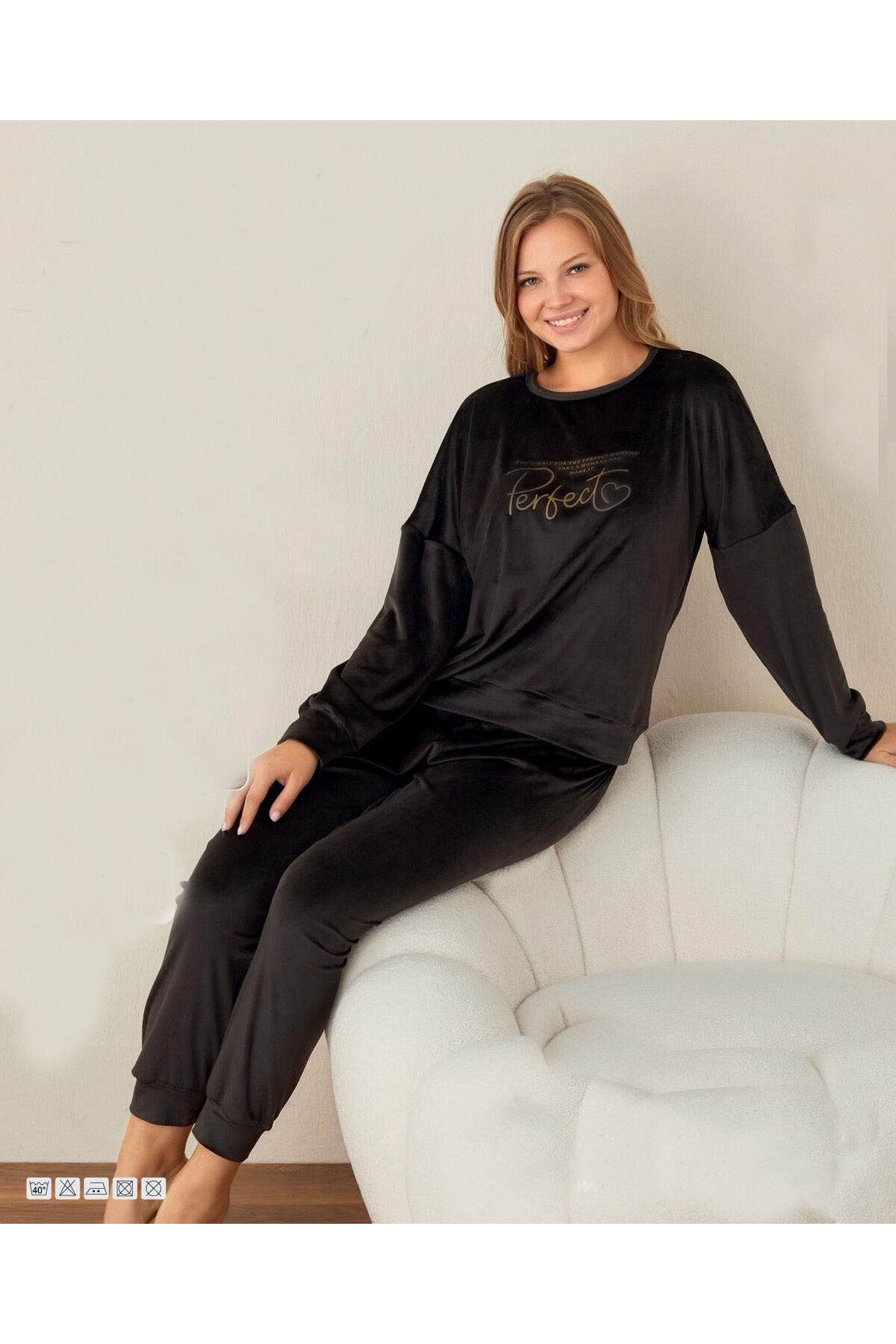 Kadife Uzun Kol Kadın Pijama Takım - Siyah