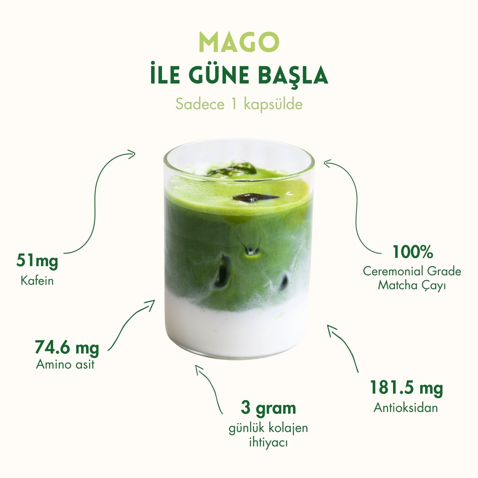 Her kapsülde 3 gram Tip 1-3 sığır kolajeni ile zenginleştirilmiş Mago Matcha™, size eşsiz bir deneyim sunarken günlük kolajen ihtiyacınızı karşılar. Parlak zümrüt yeşili rengi, güçlü gövdesi, tatlı-tuzlu alt tonları ve çiçeksi notalarıyla öne çıkar.