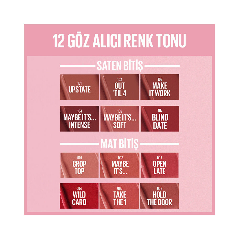 Maybelline New York'un yaratıcı ve yenilikçi ruhuyla tasarlanan bu ruj, şıklık ve bakımı bir arada sunar. Dudaklarınıza bakım yaparken onları renklendirir ve belirginleştirir.