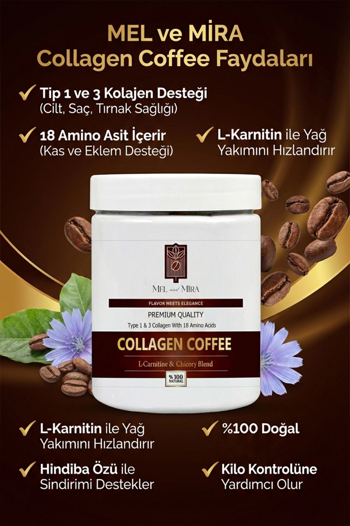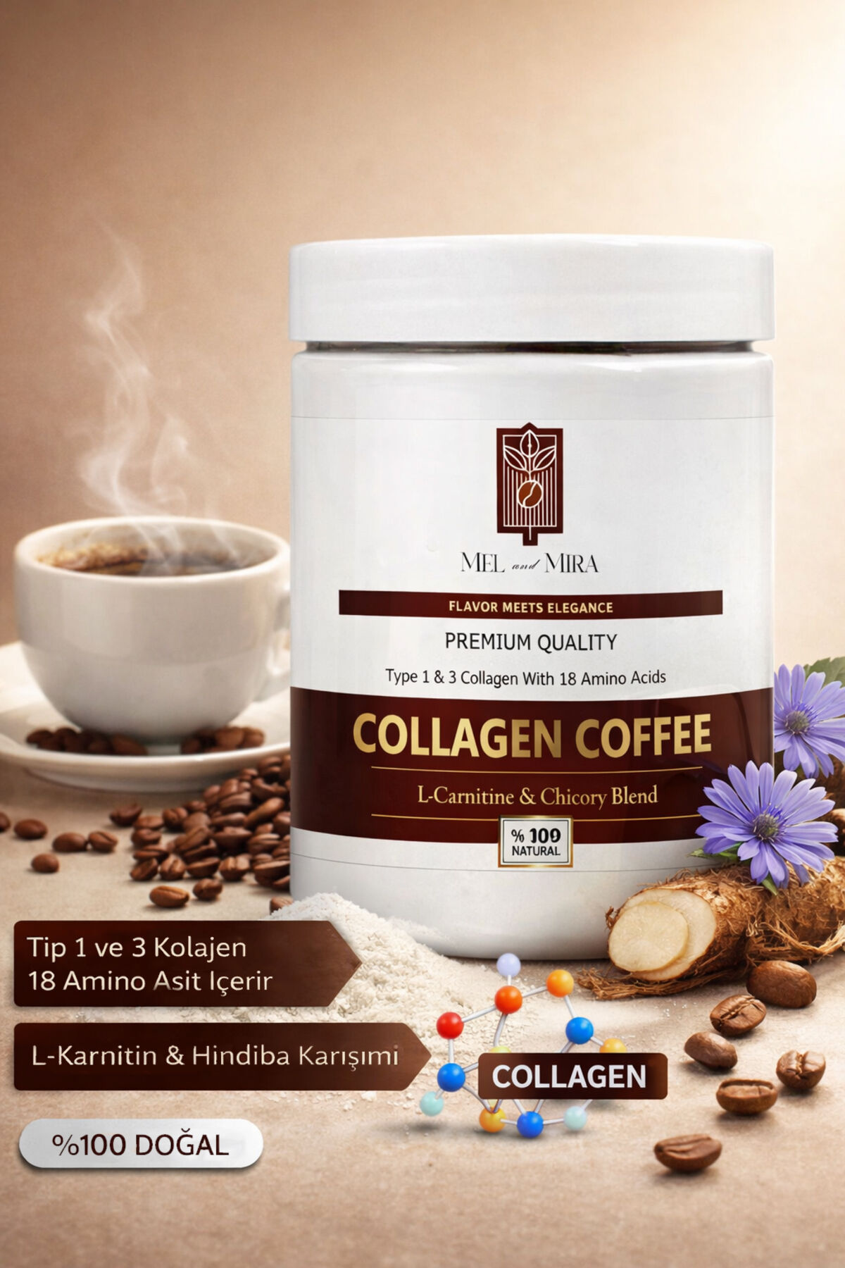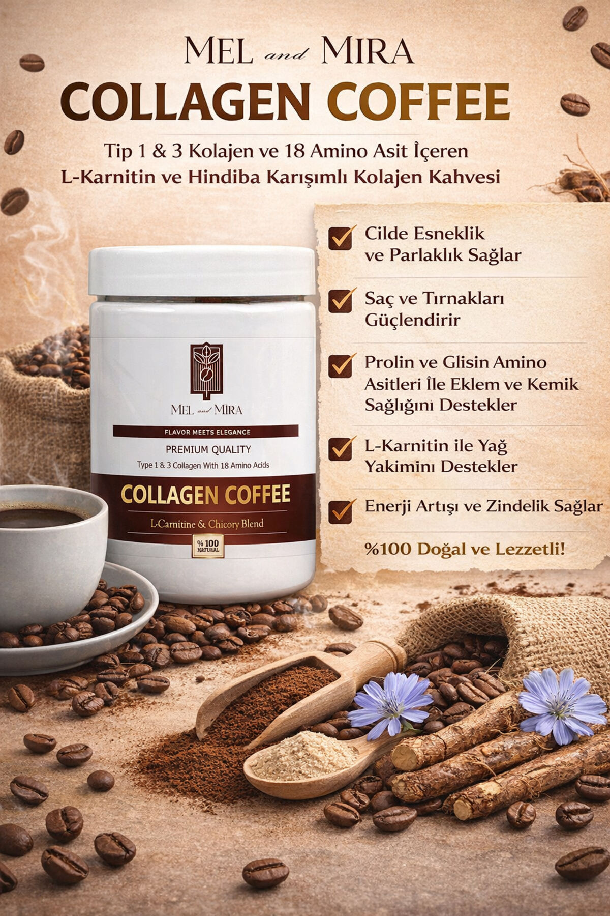Mel and Mira Organik Hidrolize Tip 1-3 Kolajen & L-Carnitine İçerikli Hindiba Kahvesi 300g | 30 Günlük