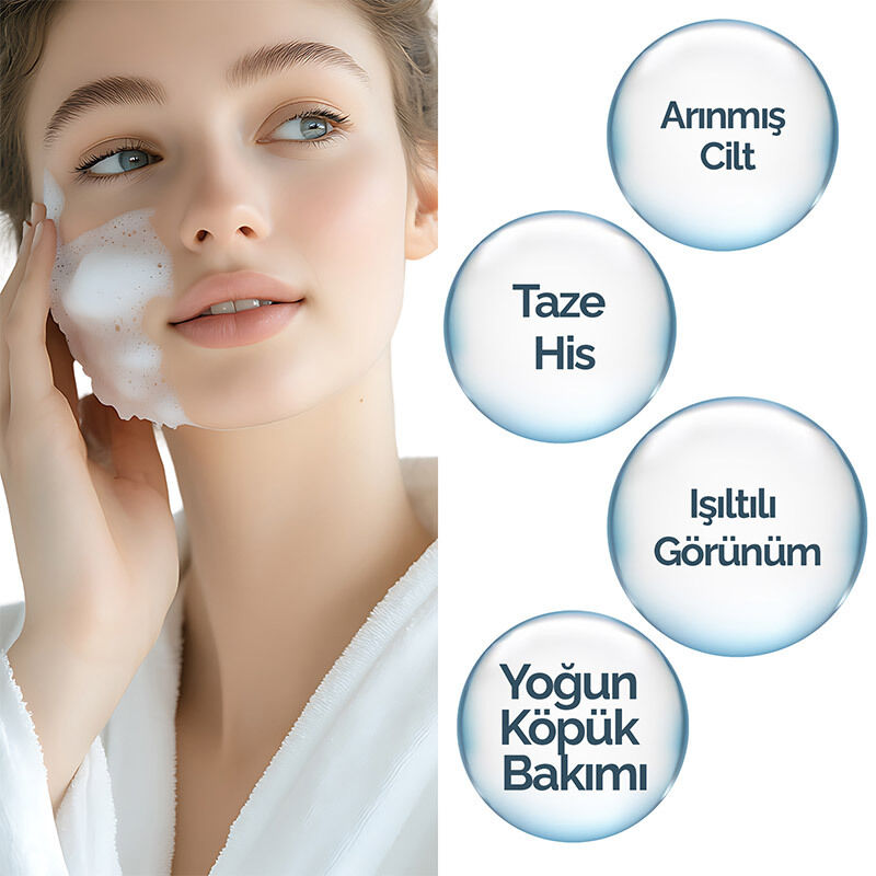 • Amino asitler, shea butter, linoleic acid, arginine, üzüm çekirdeği ekstraktı ve zeytin yaprağı ekstraktı sayesinde cildi derinlemesine temizler.