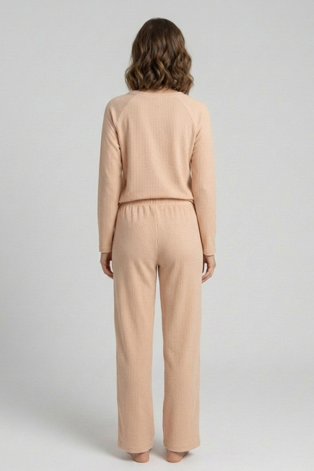 Bisiklet yaka ve uzun kollu tasarımı, sade ve rahat bir görünüm sunarken; açık pembe renk ve gofre dokusu ile ürüne sevimli, modern ve şık bir hava kazandırır. Takımı tamamlayan uyumlu uzun pijama altı ile günlük kullanımda dengeli ve rahat bir görünüm elde edilir.