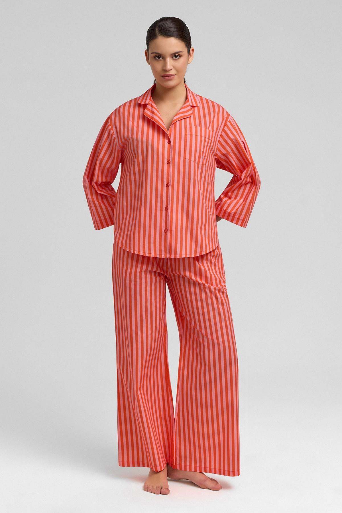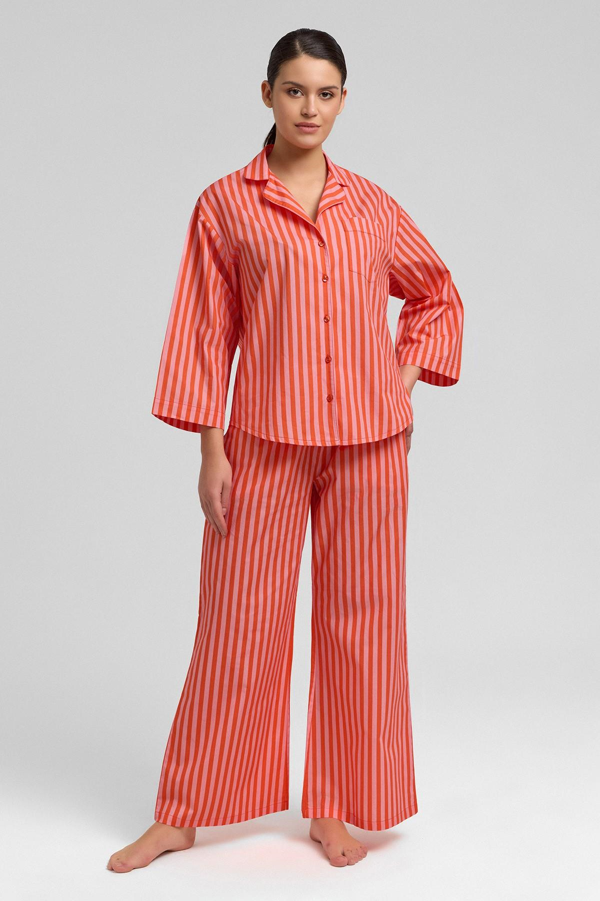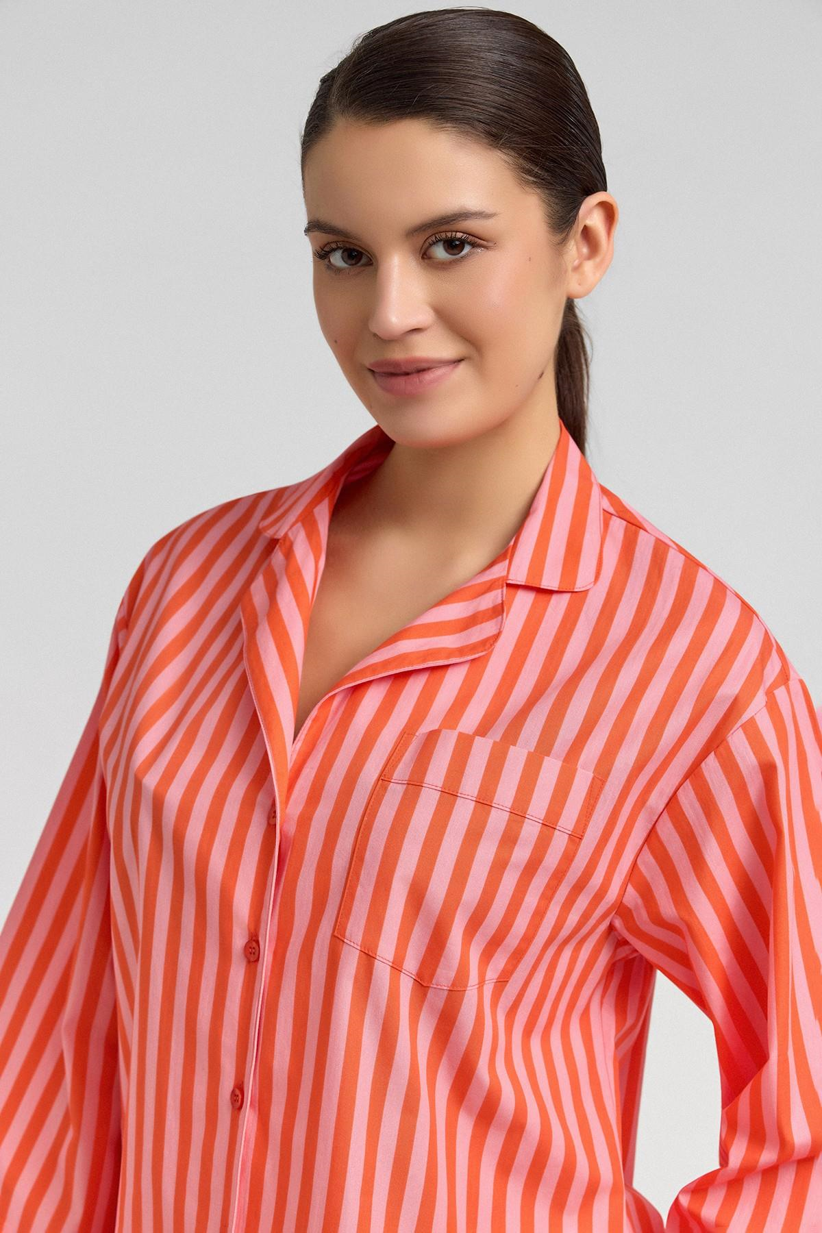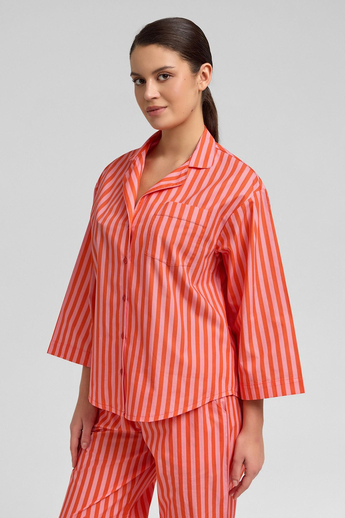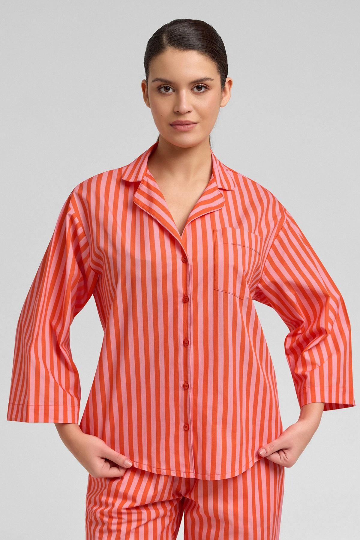 Mısırlı Kadın Pamuklu Poplin Çizgili 3/4 Kol Gömlek
