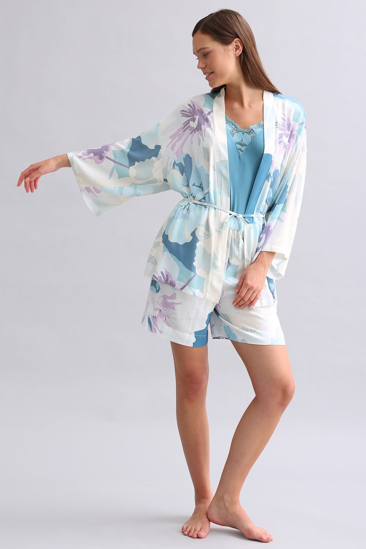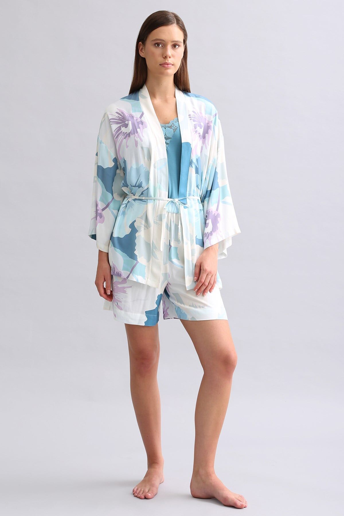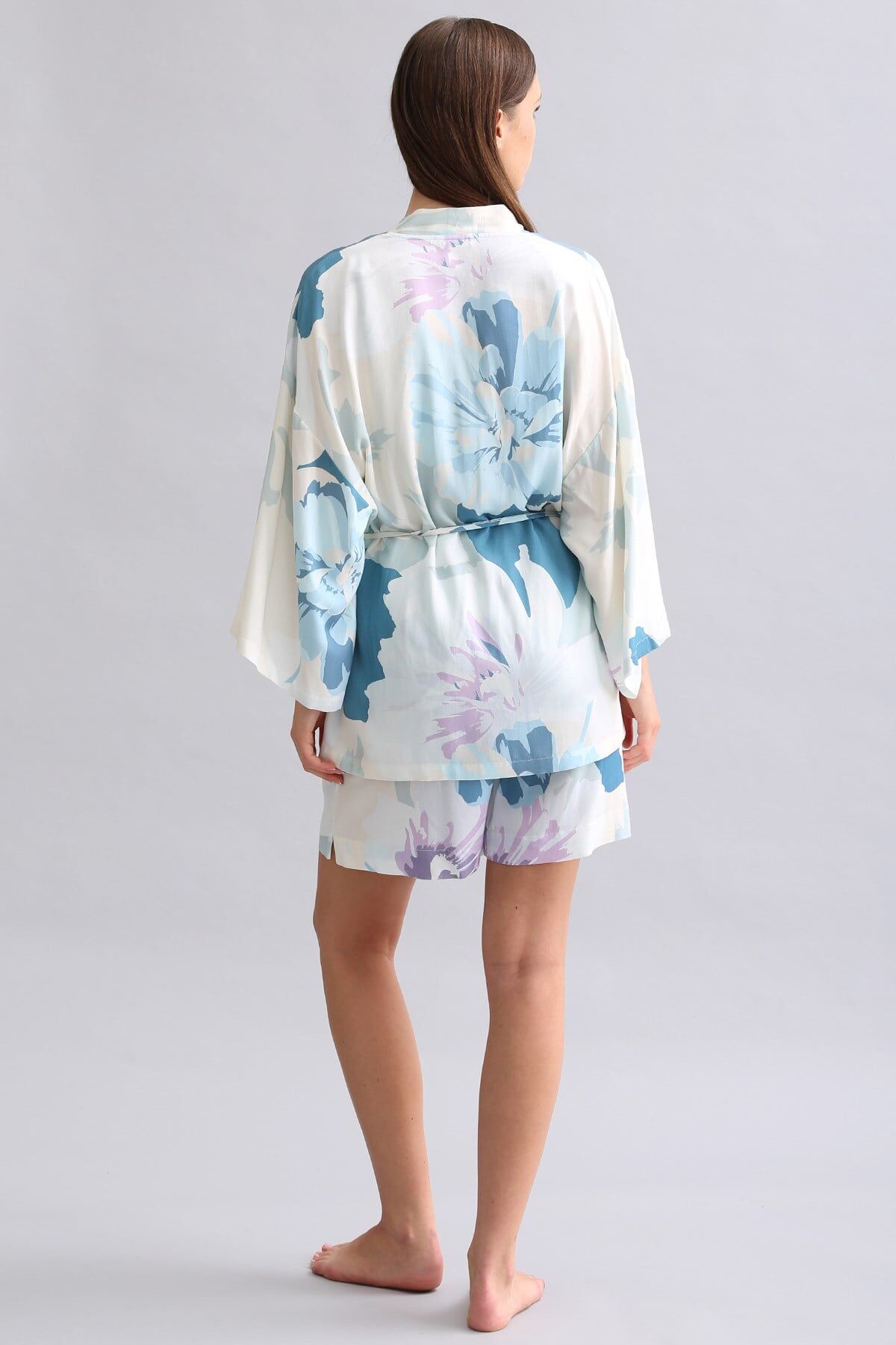 Yumuşak ve dökümlü dokusu sayesinde sabahlık hem şık hem de rahat bir görünüm sunar. Kısa boy tasarımı hareket özgürlüğü ve kolay kullanım sağlarken, modern ve sade görünümü evde konforlu stil oluşturur.