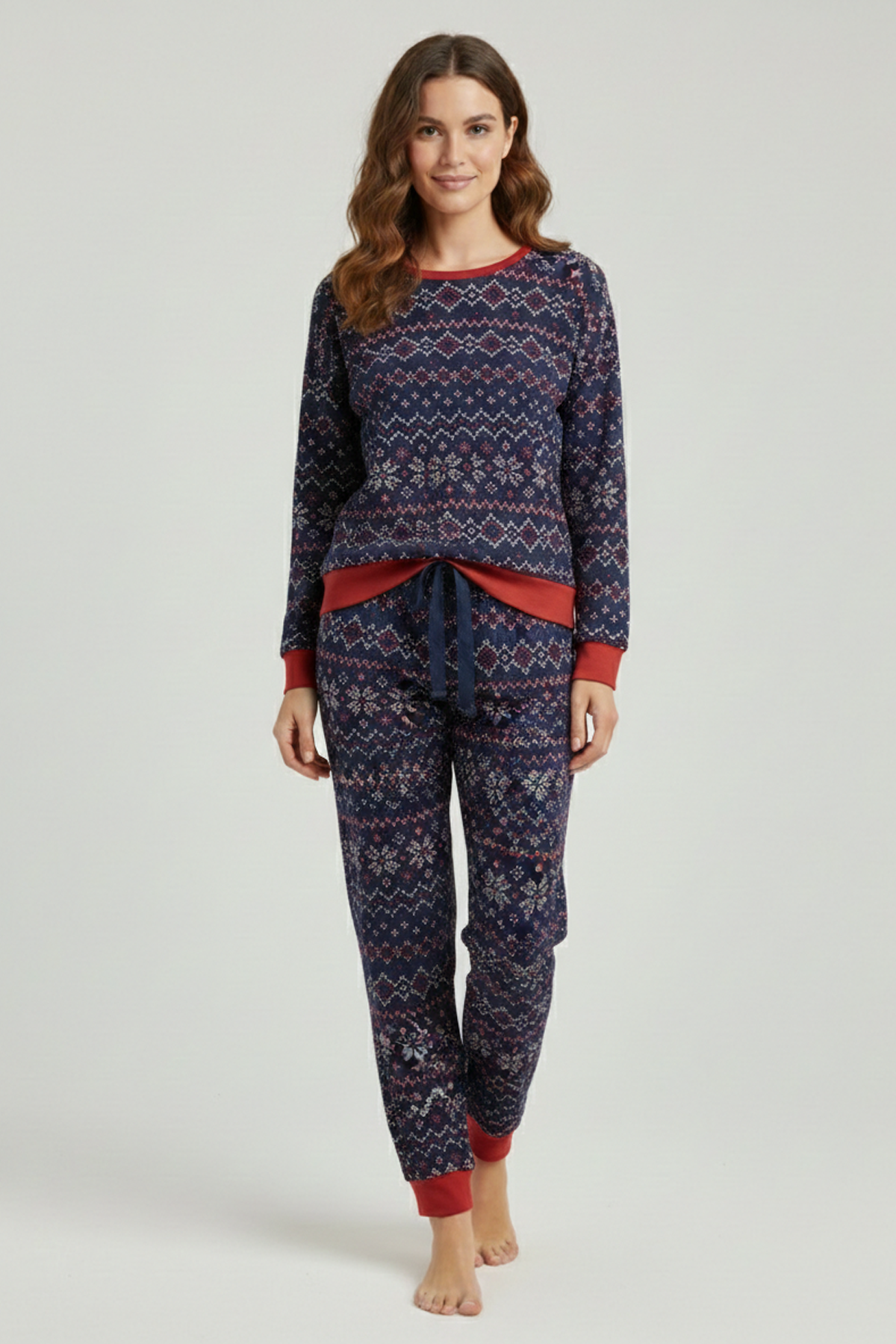 Uzun kollu gömlek tasarımı, rahat ve şık bir uyku deneyimi sunarken; kış temalı desenleri ile ürüne sıcak ve eğlenceli bir görünüm kazandırır. Takımı tamamlayan uyumlu uzun pijama altı ile konforlu ve dengeli bir kullanım elde edilir.