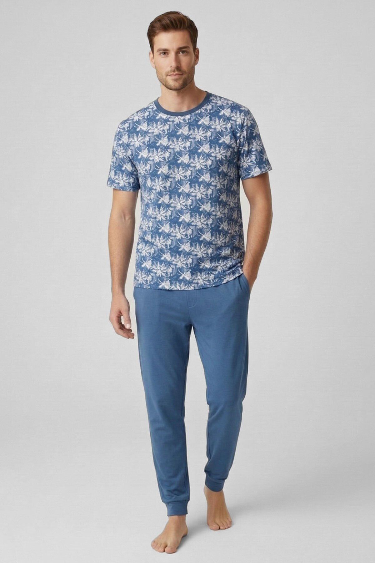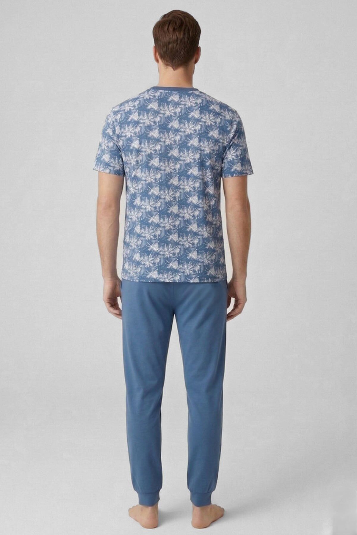 Bisiklet yaka desenli indigo t-shirt, modern ve dinamik bir görünüm sunarken; uyumlu desenli kısa şort takıma bütünlük kazandırır. İndigo uzun pijama altı ise mevsim geçişlerinde ve daha serin dönemlerde konforlu kullanım sağlayarak ürünü çok yönlü hale getirir.