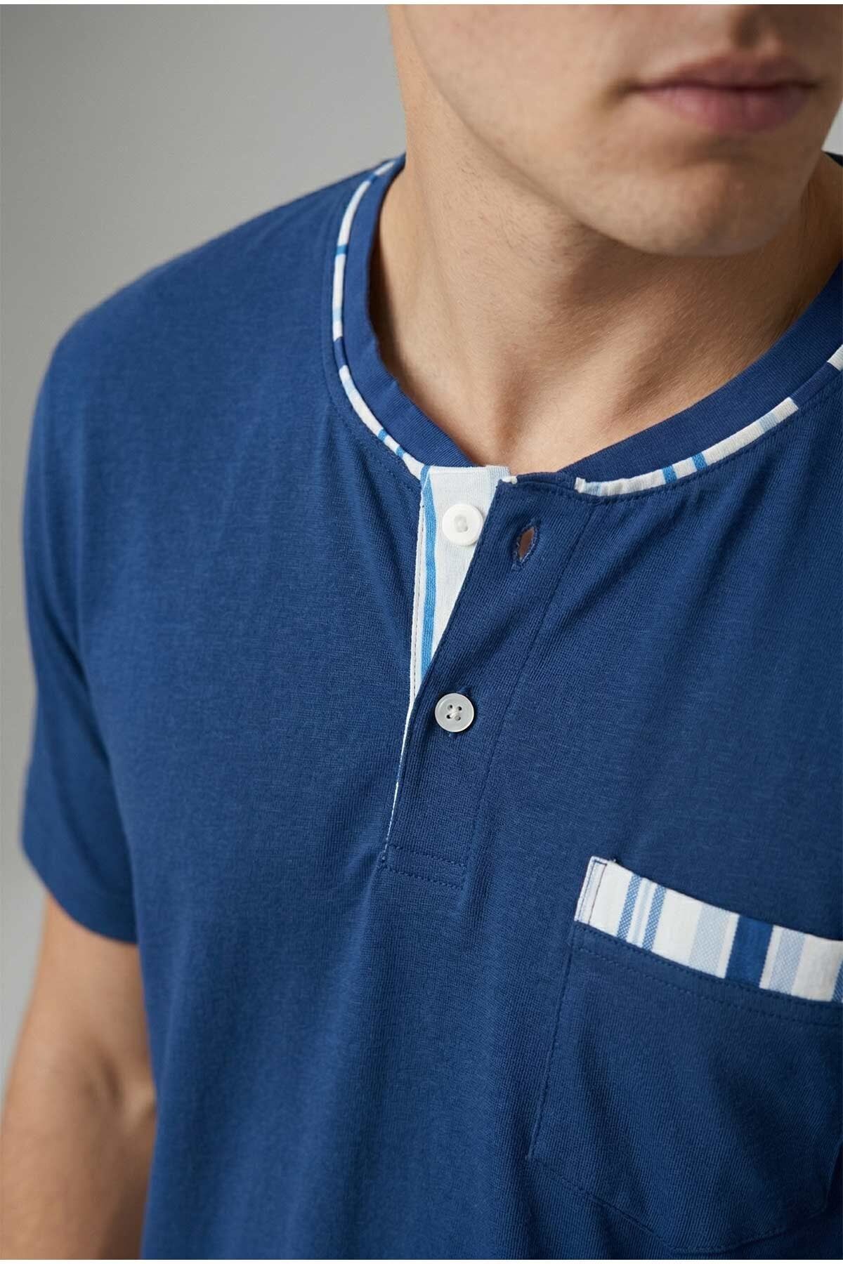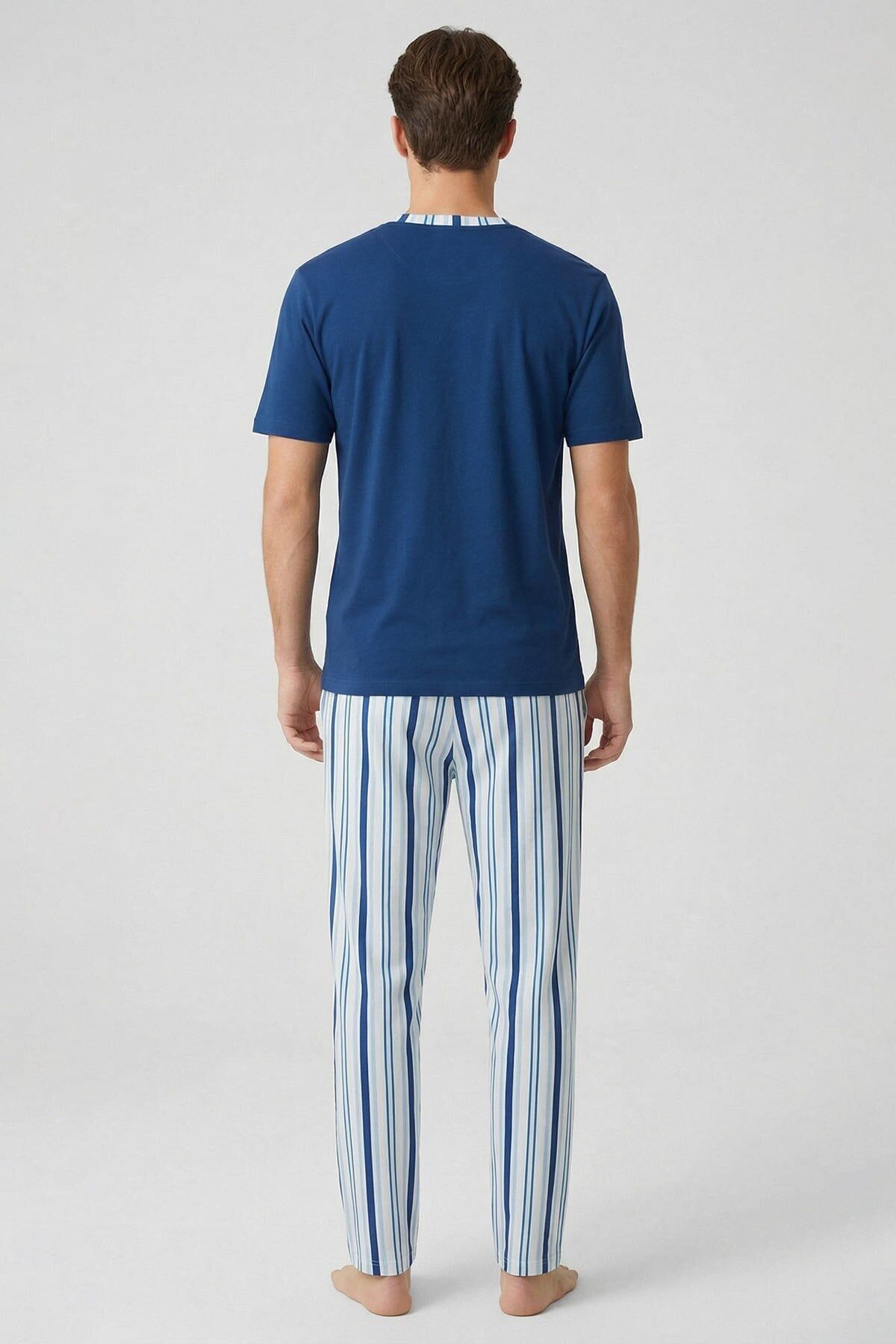 Sıfır yaka kısa kollu t-shirt, üzerinde yer alan flota cep detayı ile modern ve şık bir görünüm kazandırırken; lacivert kısa şort spor ve rahat bir stil oluşturur. Şort üzerindeki biye detayları takıma dinamik bir hava katarken, çizgili uzun pijama altı ile mevsim geçişlerinde kullanıma uygun çok yönlü bir yapı sunar.