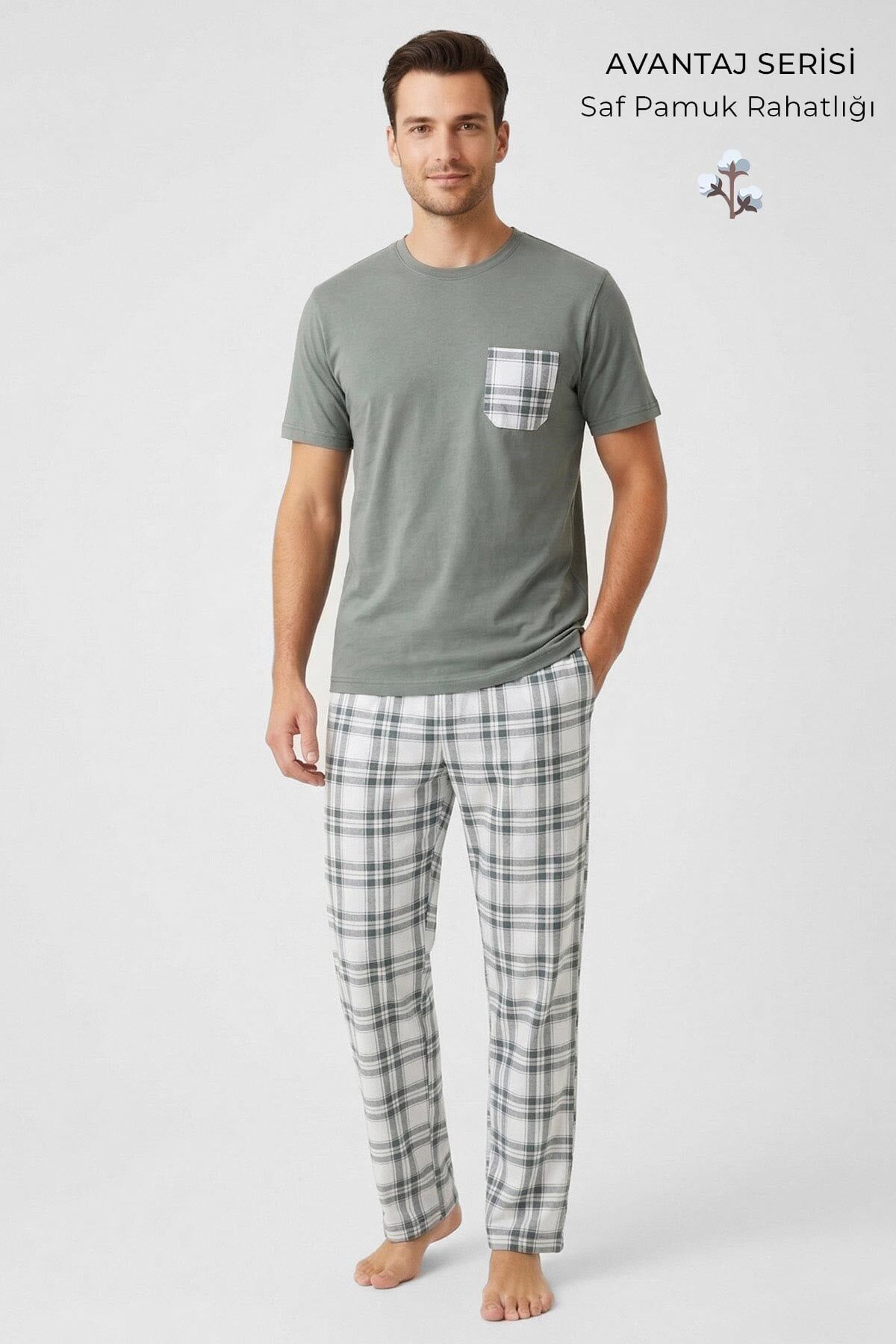 Bisiklet yaka adaçayı renk t-shirt, doğal ve modern görünümü ile öne çıkarken; üzerindeki ekose cep detayı tasarıma dikkat çekici bir şıklık kazandırır. Takıma eşlik eden ekose desenli uzun pijama altı, uyumlu ve trend bir görünüm oluşturur.