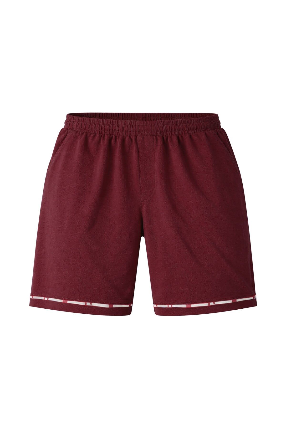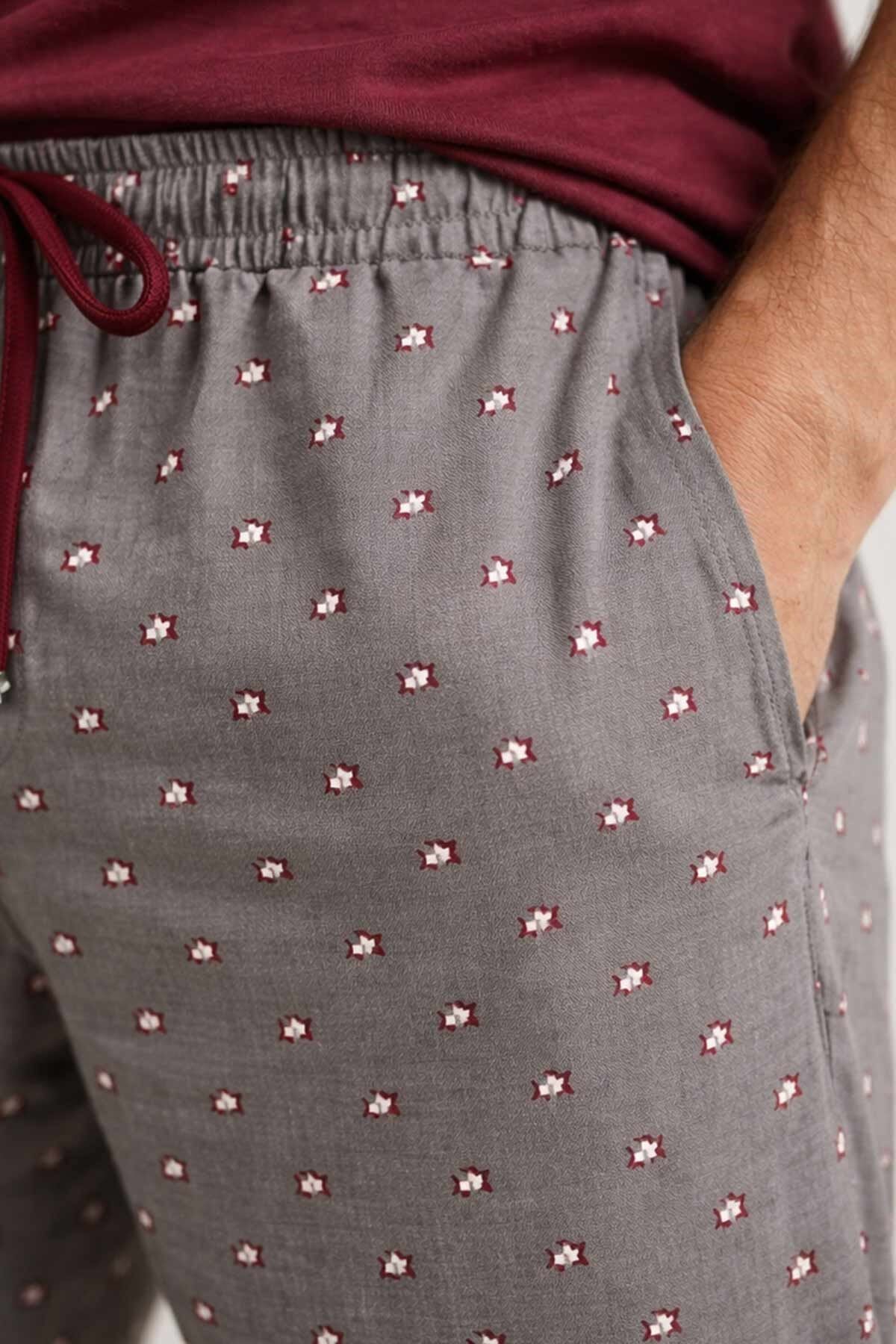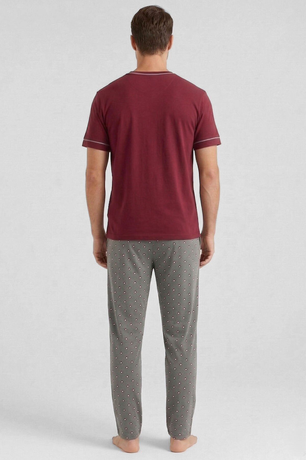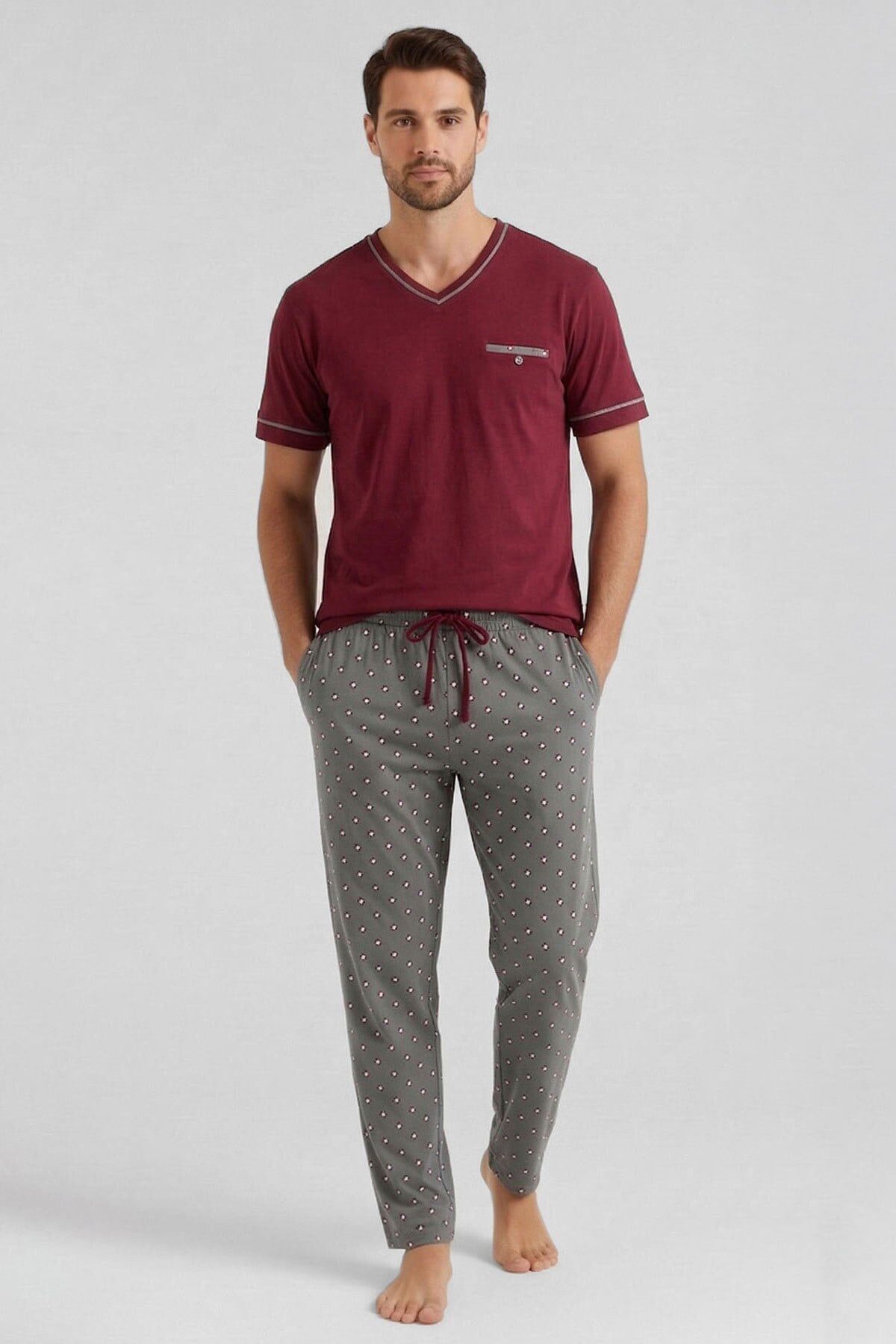 V yaka t-shirt tasarımı, üzerindeki flota cep detayı ile estetik ve fonksiyonel bir görünüm sunarken; bordo kısa şort takıma enerjik bir hava kazandırır. Antrasit zemin üzerine geometrik desenli uzun pijama altı ise dikkat çekici ve trend bir stil oluşturarak takımı tamamlar.