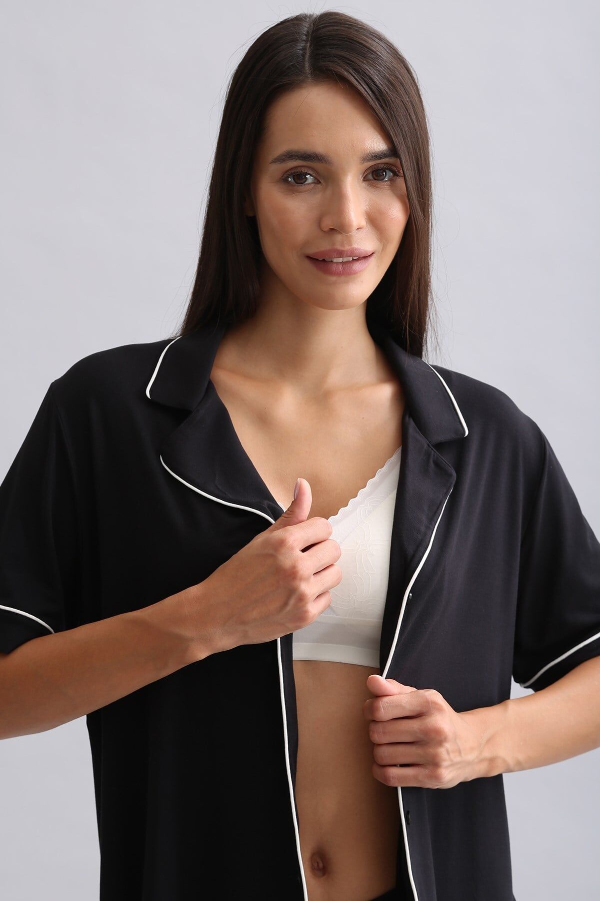 KPJM000185 Bambu Pamuk Elastan Kadın Gömlek Yaka Pijama Üstü
