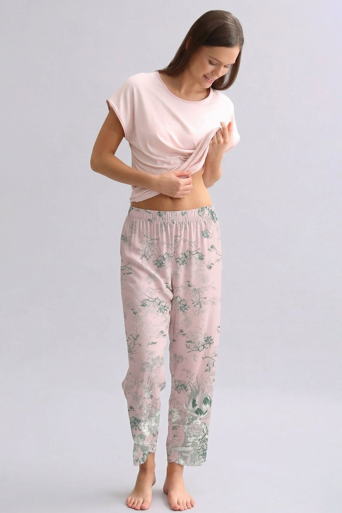 %100 viskose dokuma kumaştan üretilen bu pijama, yumuşak ve nefes alabilen yapısıyla gece boyu konfor sağlar. Hafif ve dökümlü kesimi sayesinde yazlık pijama arayanlar için ideal bir seçimdir.
